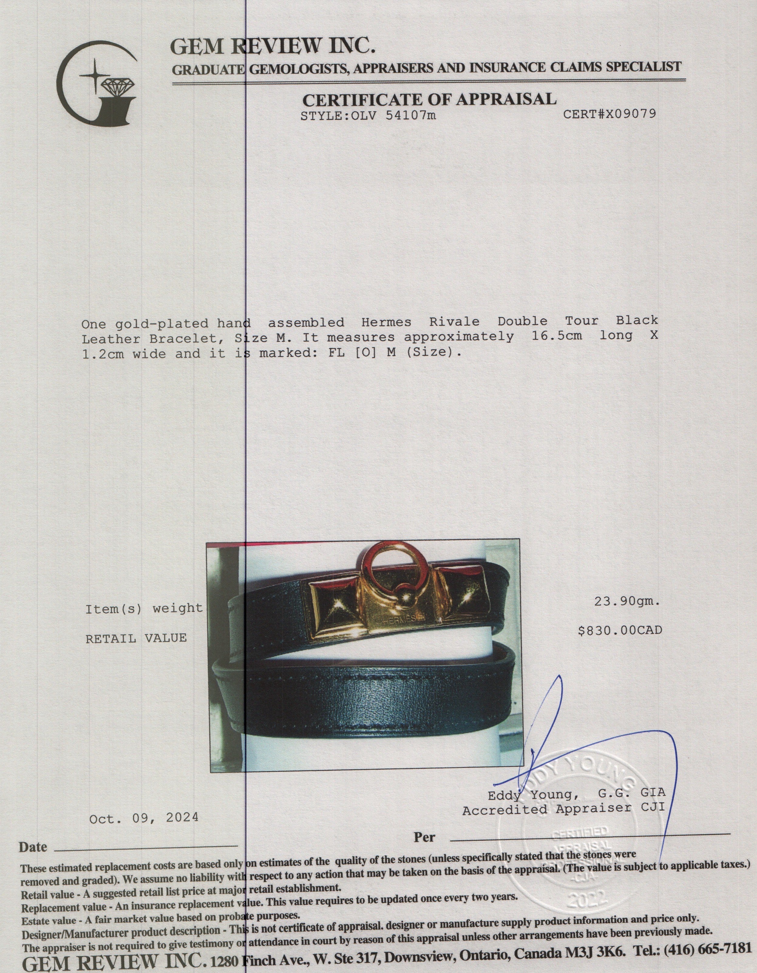 Gold Plated Rivale Double Tour Black Leather Bracelet, Size M w/ Box