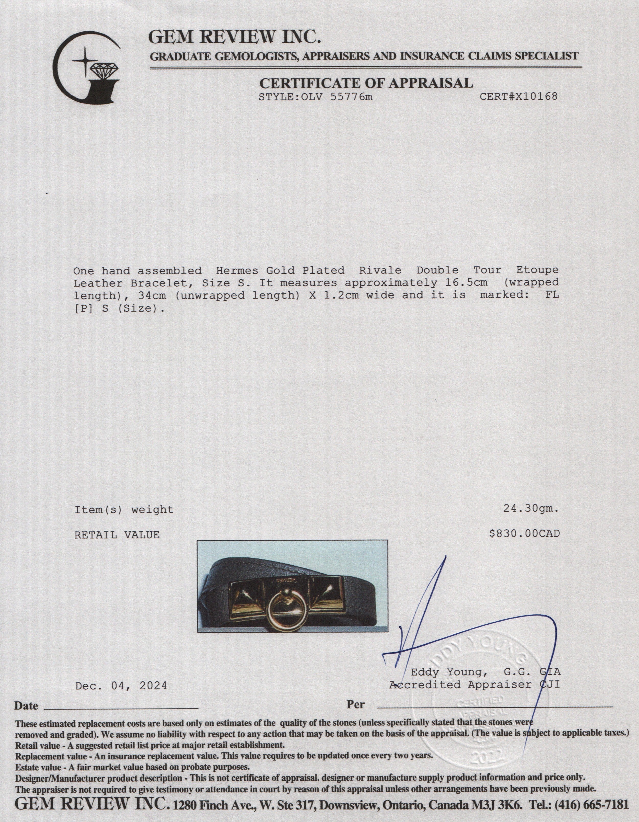 Gold Plated Rivale Double Tour Etoupe Leather Bracelet, Size S w/ Box