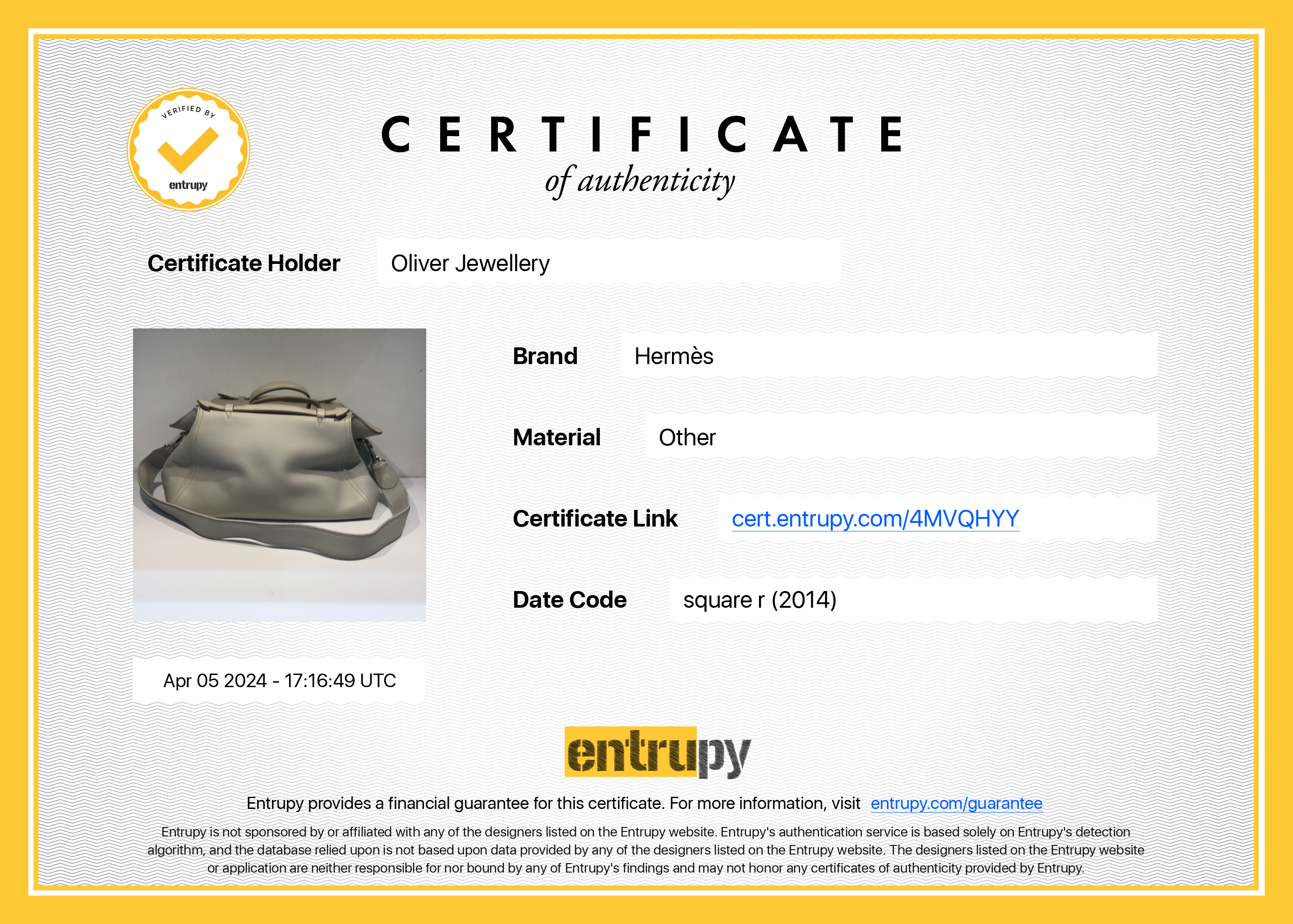 Dust Bag, Strap, Entrupy Certificate of Authenticity