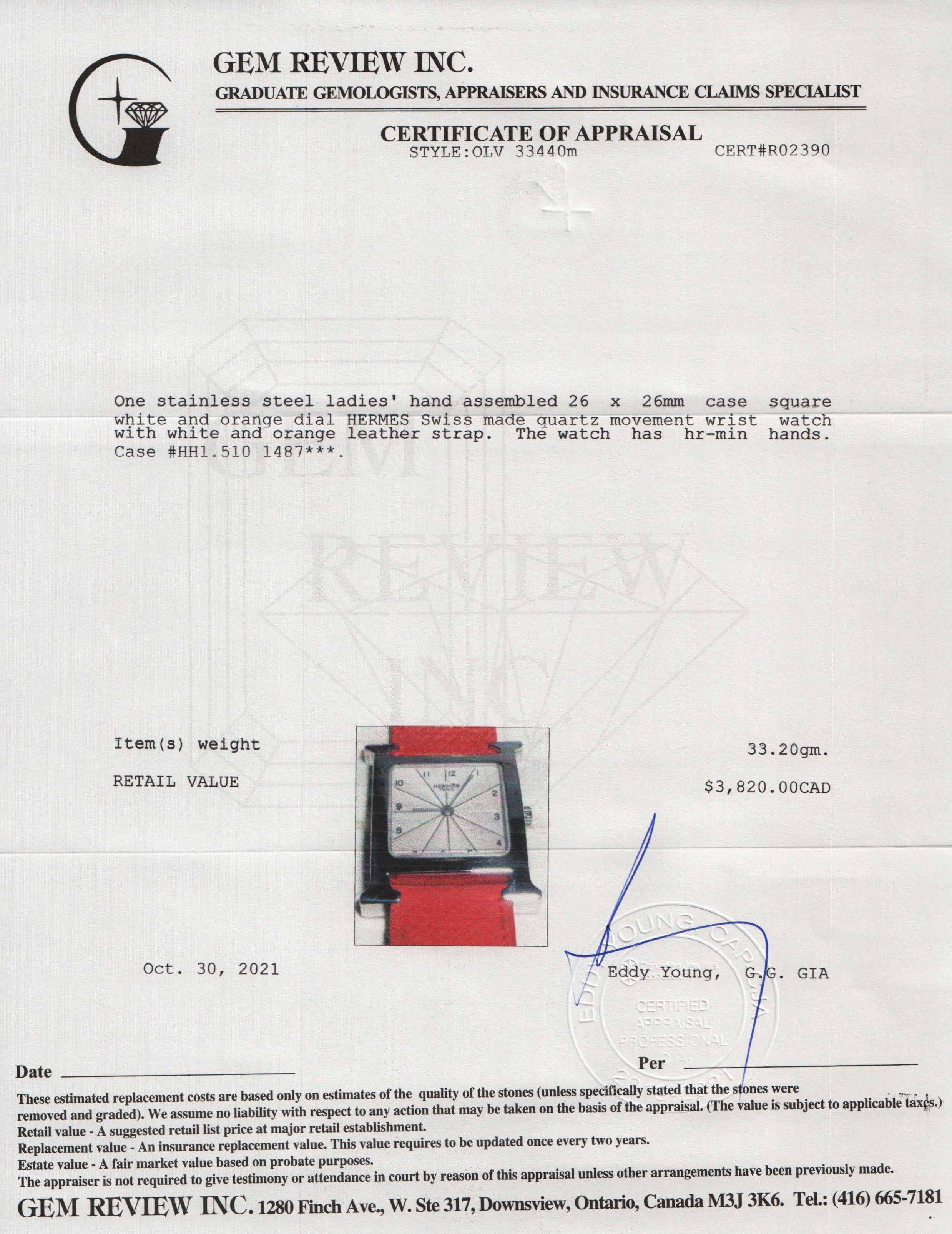 Included Items: Extra Hermes Black Leather Strap & Gem Review Appraisal