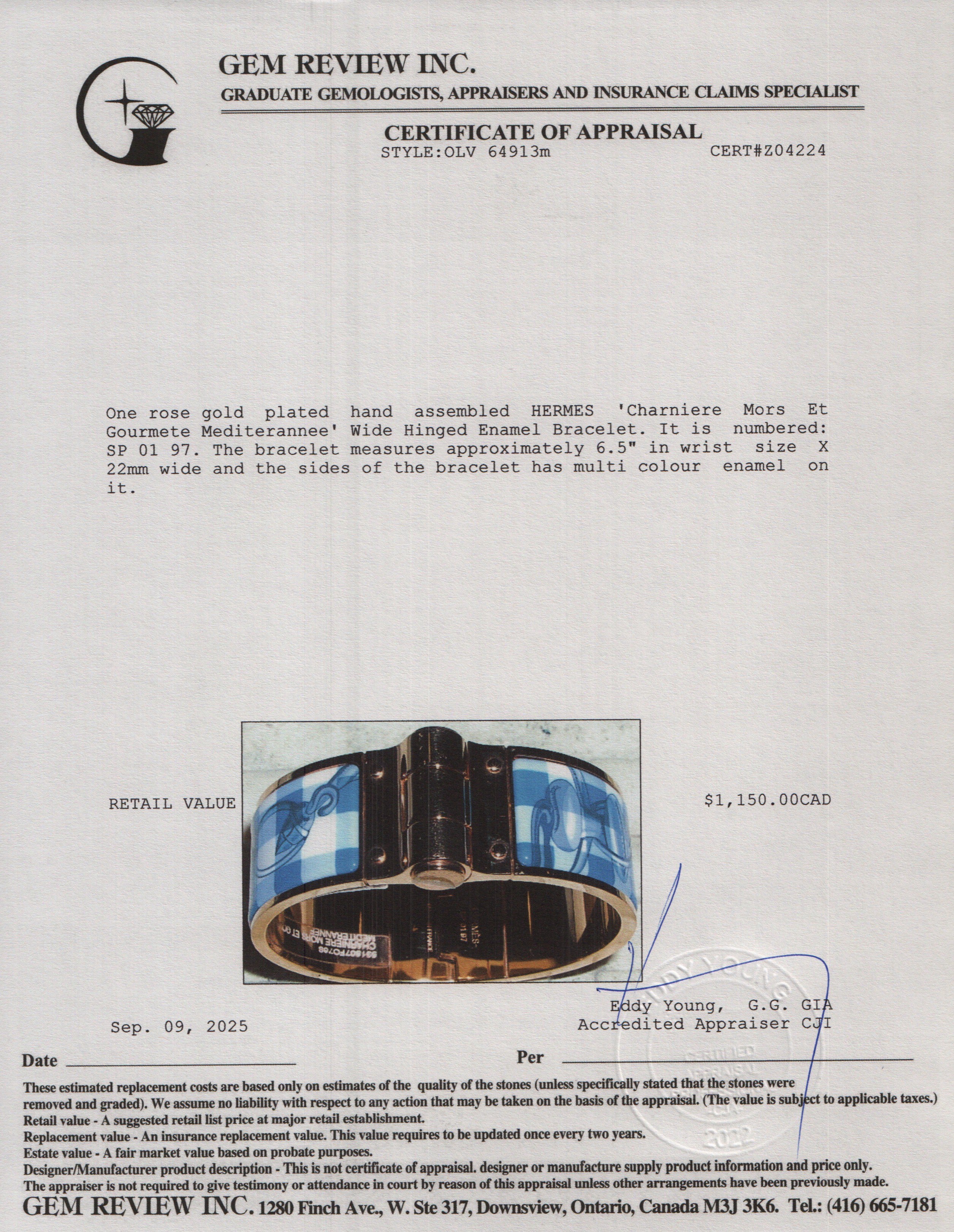 Rose Gold Plated ' Charniere Mors Et Gourmete Mediterannee' Wide Hinged Enamel Bracelet w/ Box