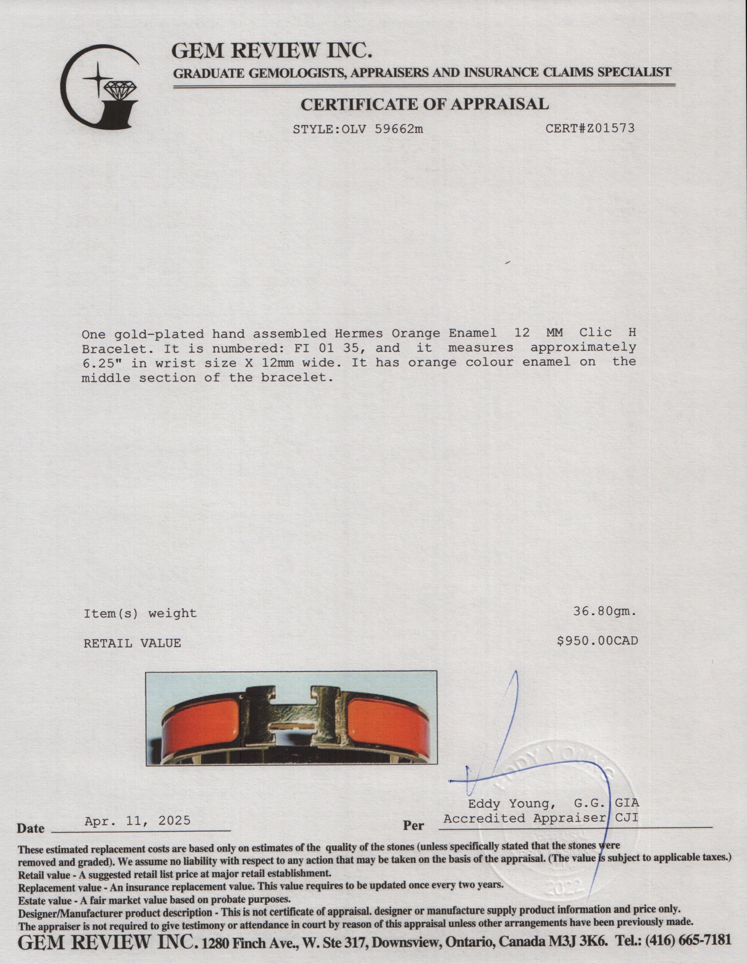 Yellow Gold Plated Orange Enamel 12 MM Clic H Bracelet