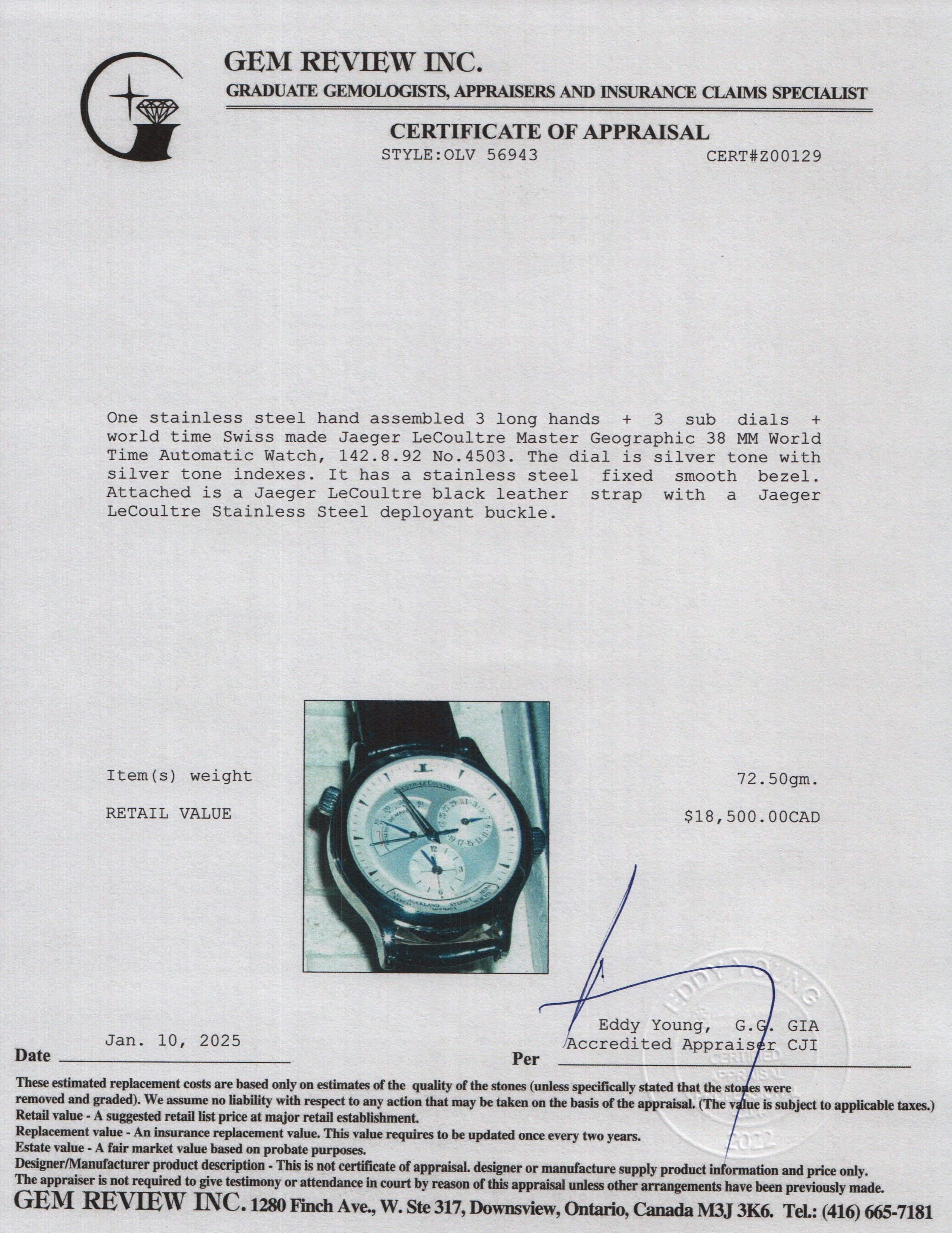 Jaeger LeCoultre Stainless Steel Master Geographic 38 MM World Time Automatic Watch