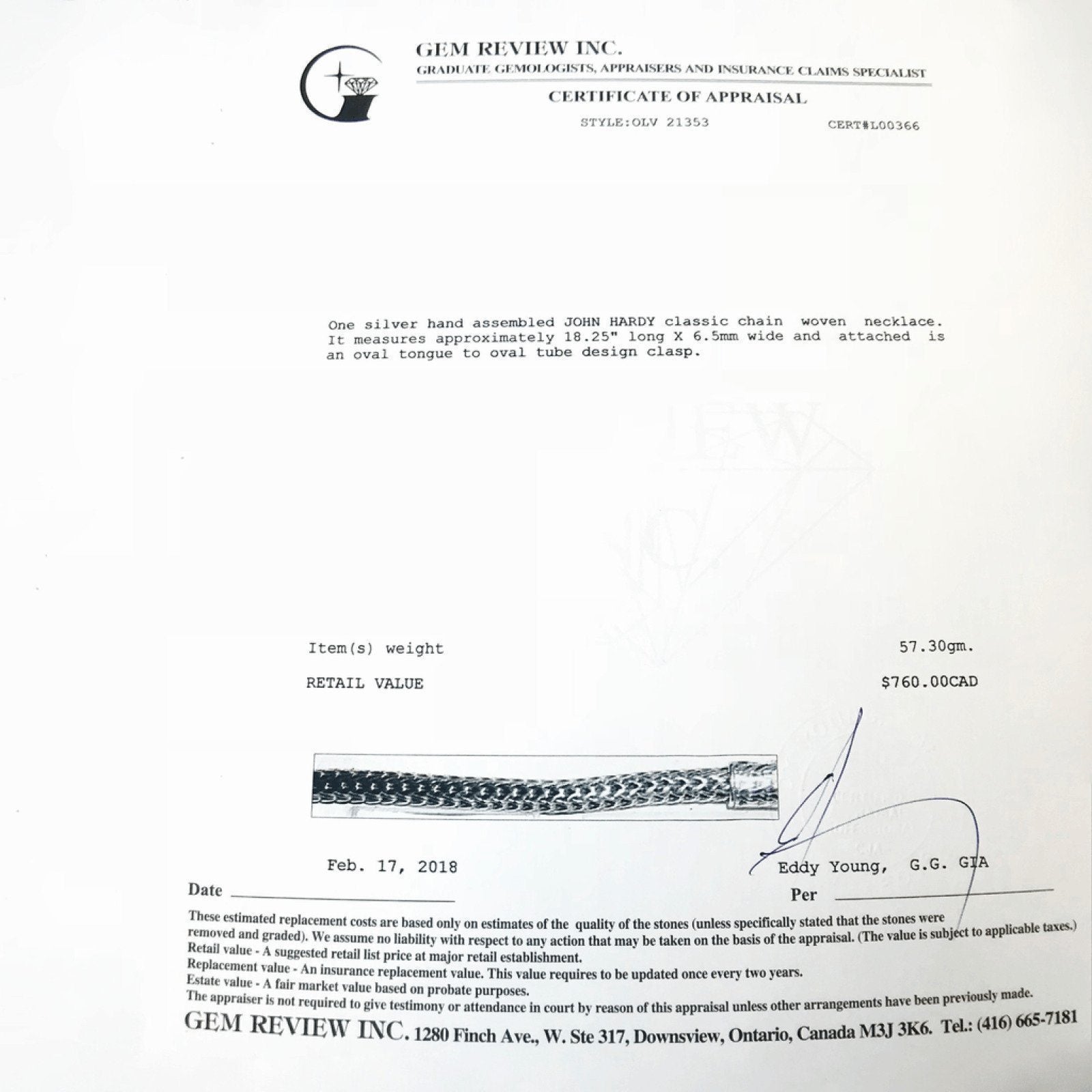 John Hardy Classic Chain Woven Necklace in Sterling Silver with an Oval Tongue to Oval Tube Design Clasp, Approximately 18” Long x 6mm Wide, Comes with Gem Review Appraisal