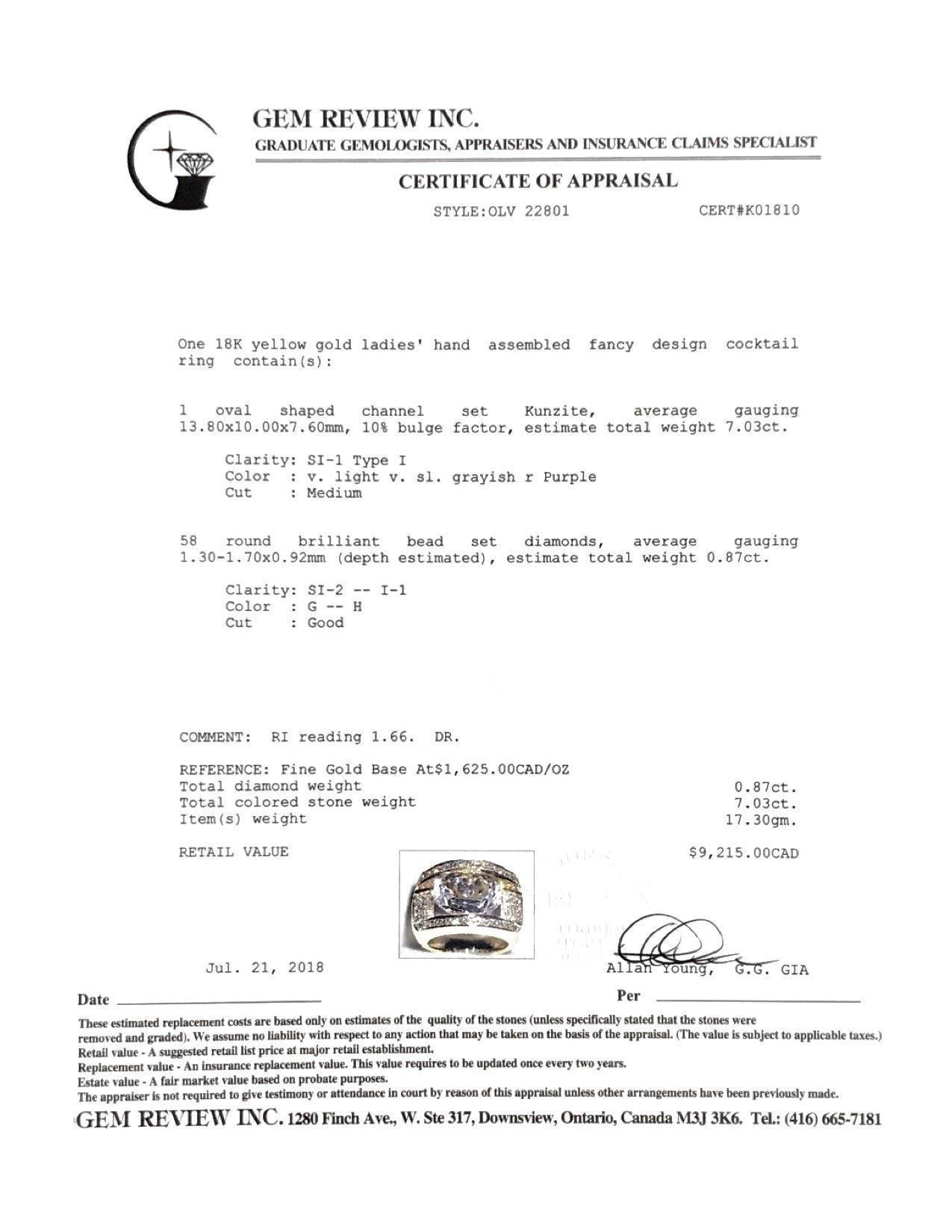 - 1 Oval Shaped Kunzite Weighing Approximately 7.03 ct.