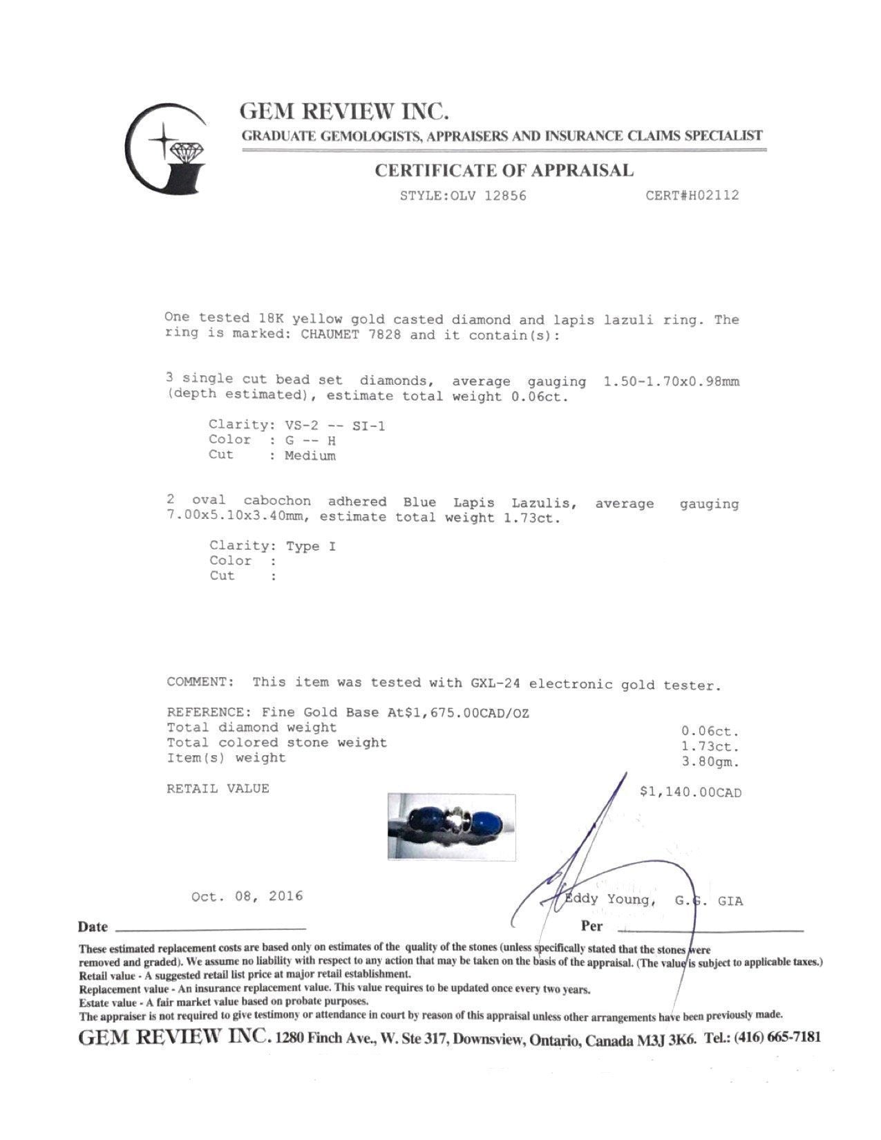 Lapis Lazuli and Diamond Ring in 18kt Yellow Gold; Contains 3 Single Cut Bead Set Diamodns Totaling Approximately 0.06 ct. of VS2-SI1 Clarity, G-H Colour, and 2 Oval Cabochon Blue Lapis Lazulis Totaling Approximately 1.73 ct.; Size 5 1/2; Comes with $1,140 Gem Review Appraisal