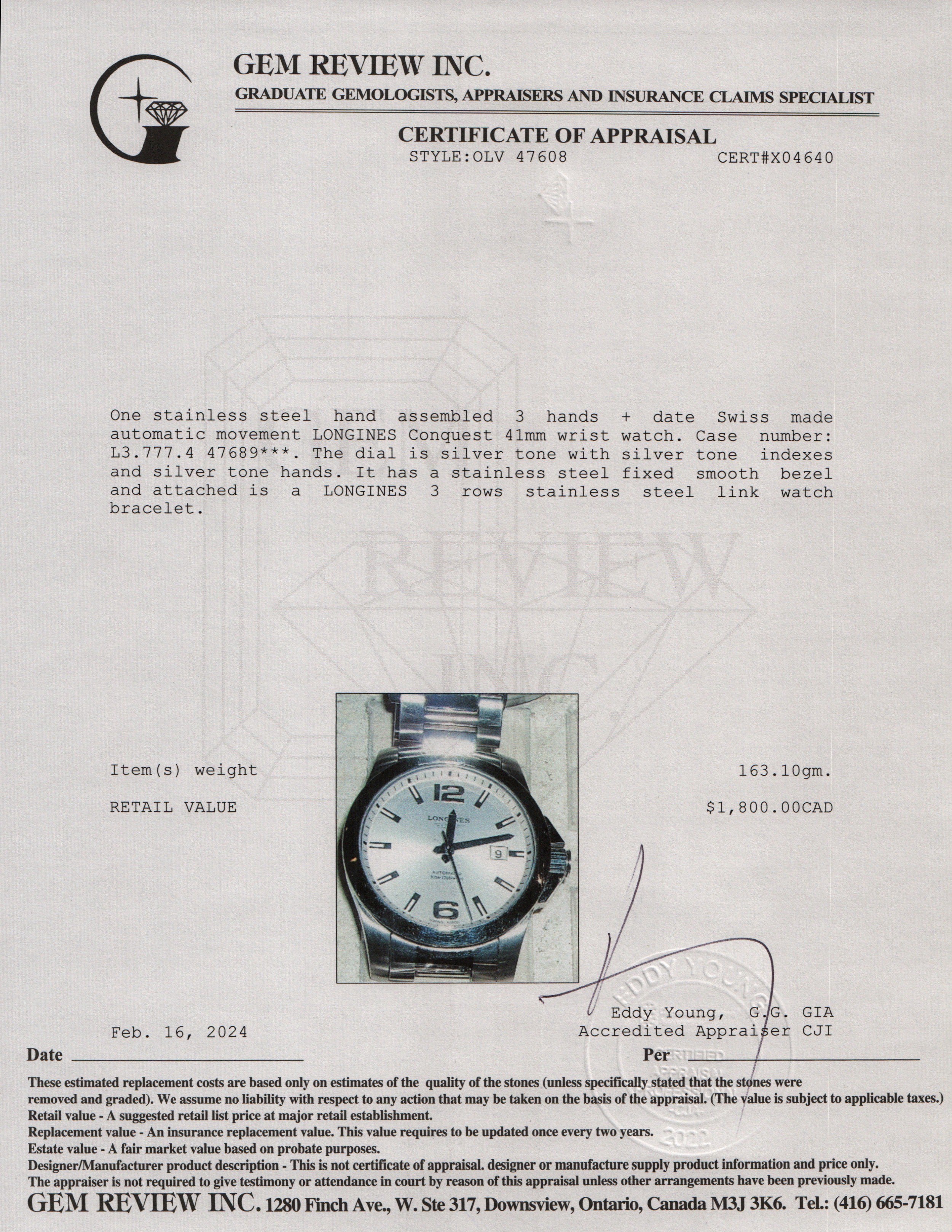 Stainless Steel Conquest 41 MM Automatic Watch w/ Box & Papers