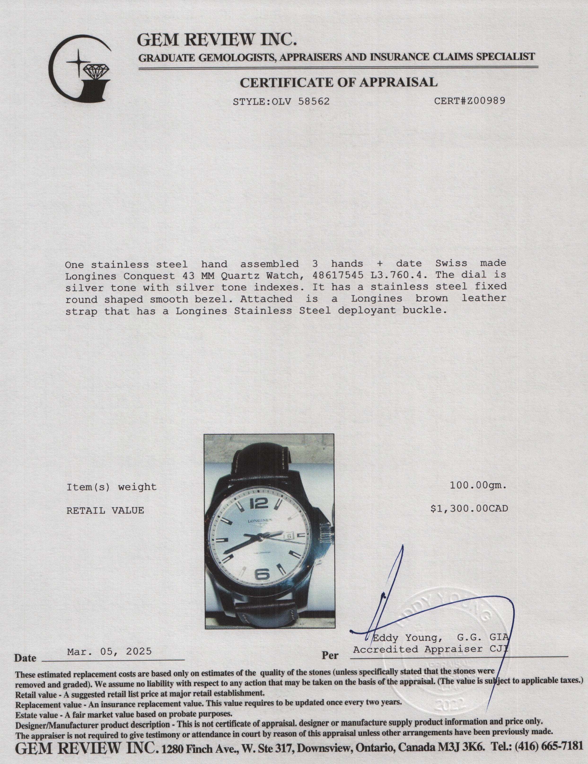 Stainless Steel Conquest 43 MM Quartz Watch w/ Box
