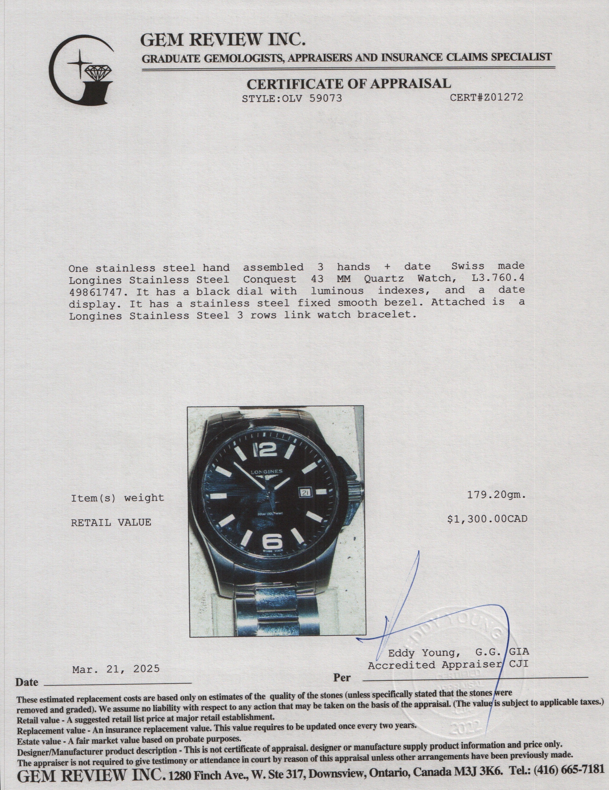 Stainless Steel Conquest 43 MM Quartz Watch w/ Box & Papers