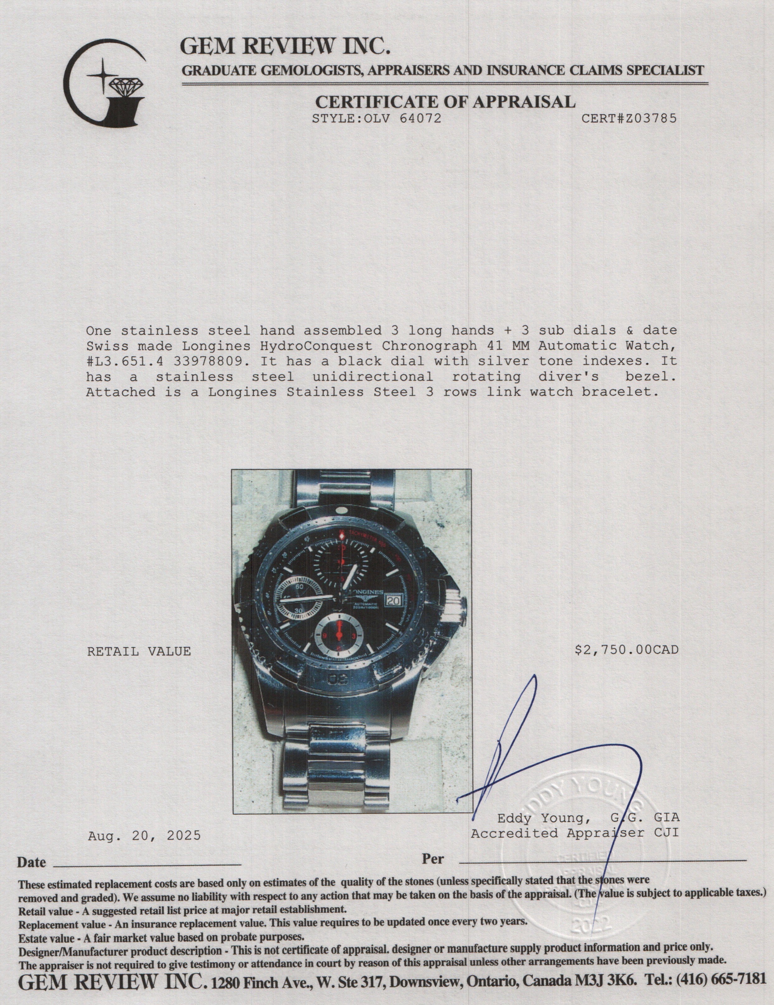 Stainless Steel HydroConquest 41 MM Automatic Watch Black Dial