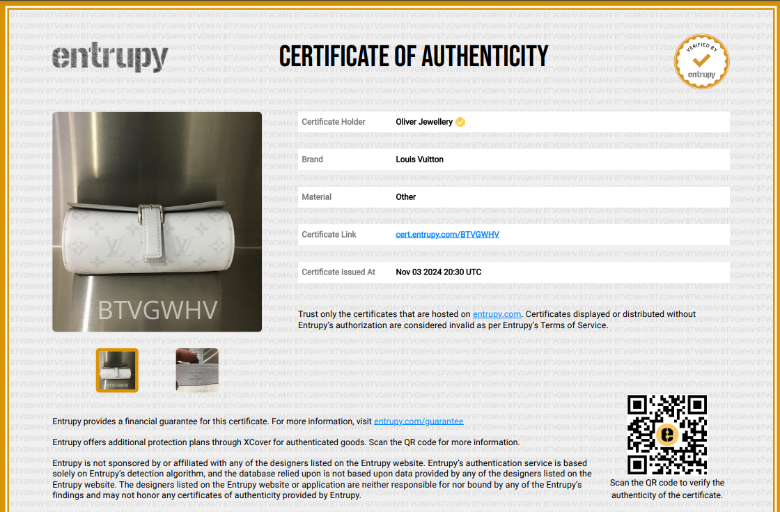 Dust Bag, Tag, Entrupy Certificate of Authenticity