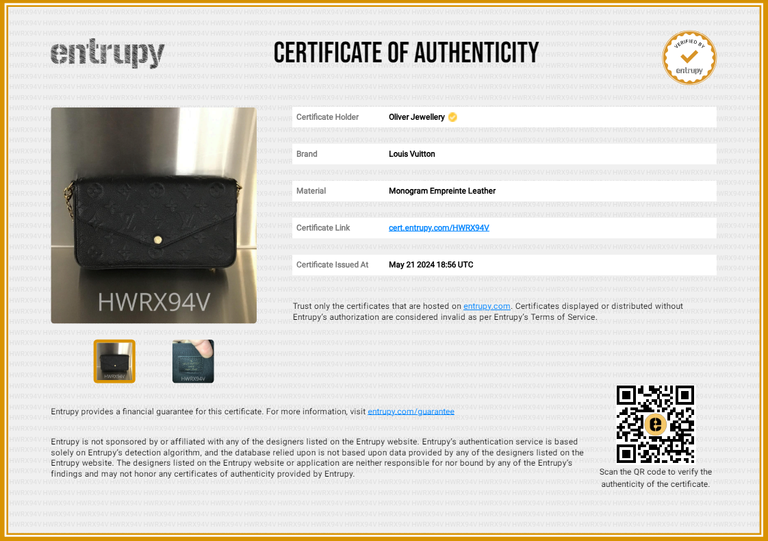 Box, Receipt, Inserts, Entrupy Certificate of Authenticity
