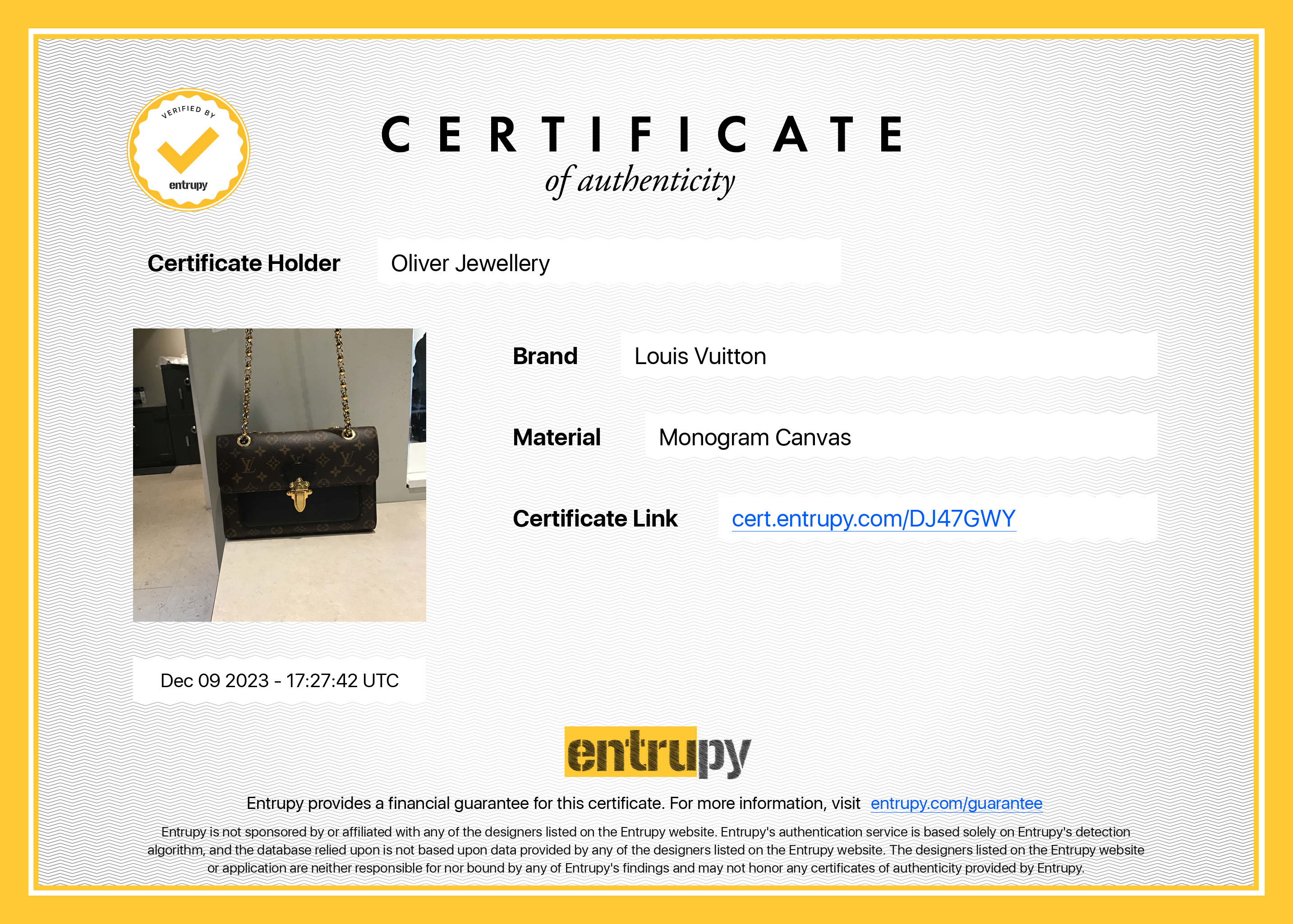 Dust Bag, Entrupy Certificate of Authenticity