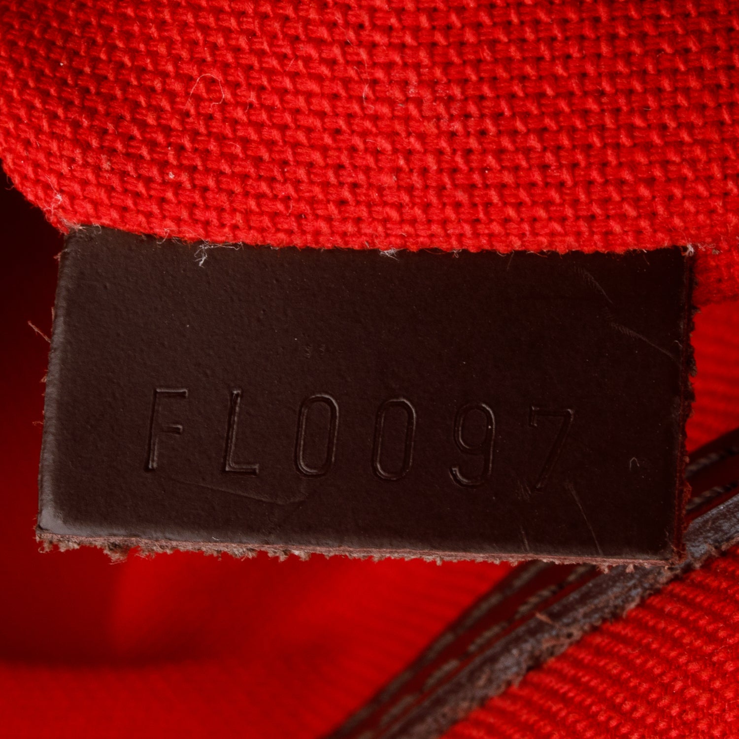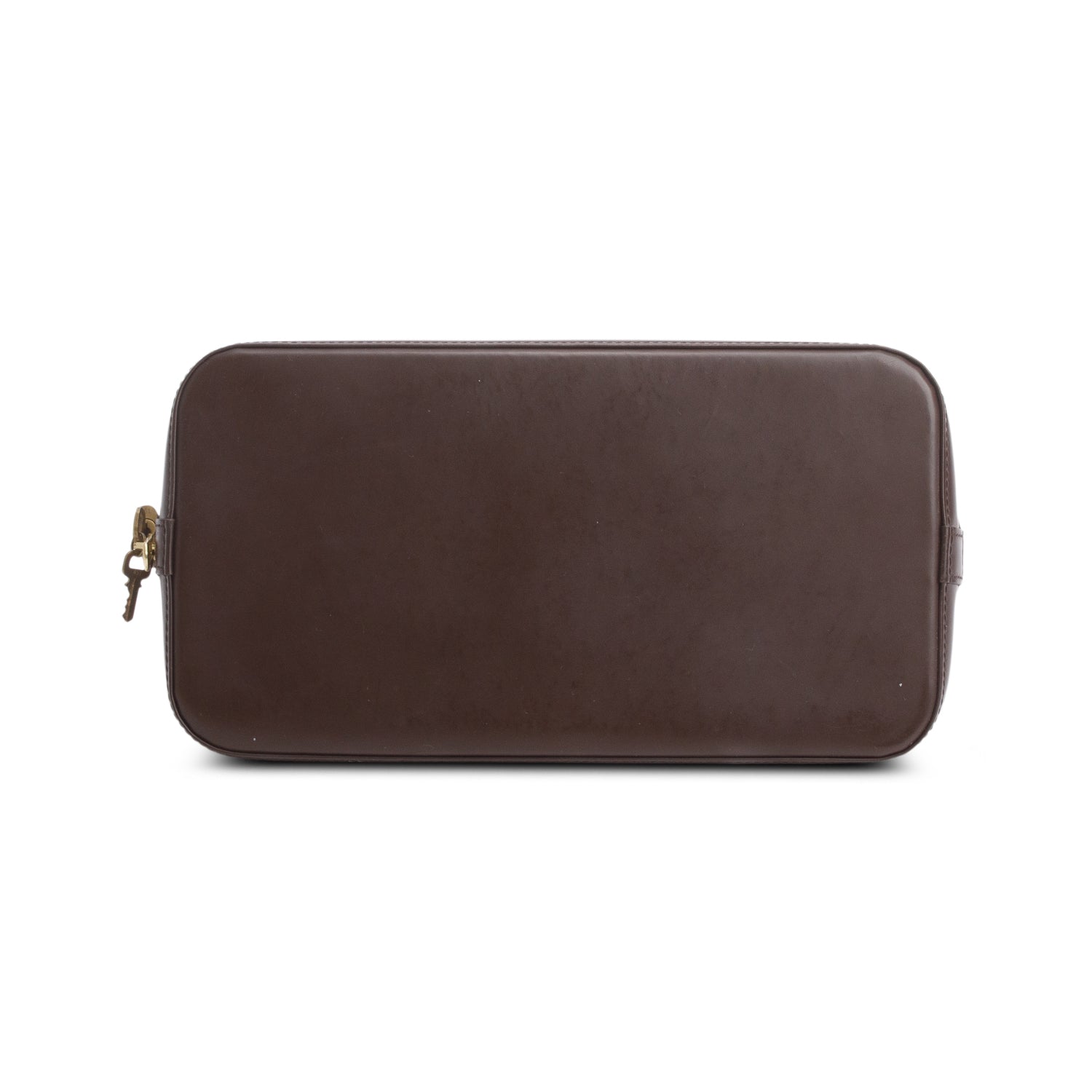 Condition: Very Good; slight tarnishing at hardware; minor scratches and scuffing at exterior leather base; minor creasing at handles; clean interior.