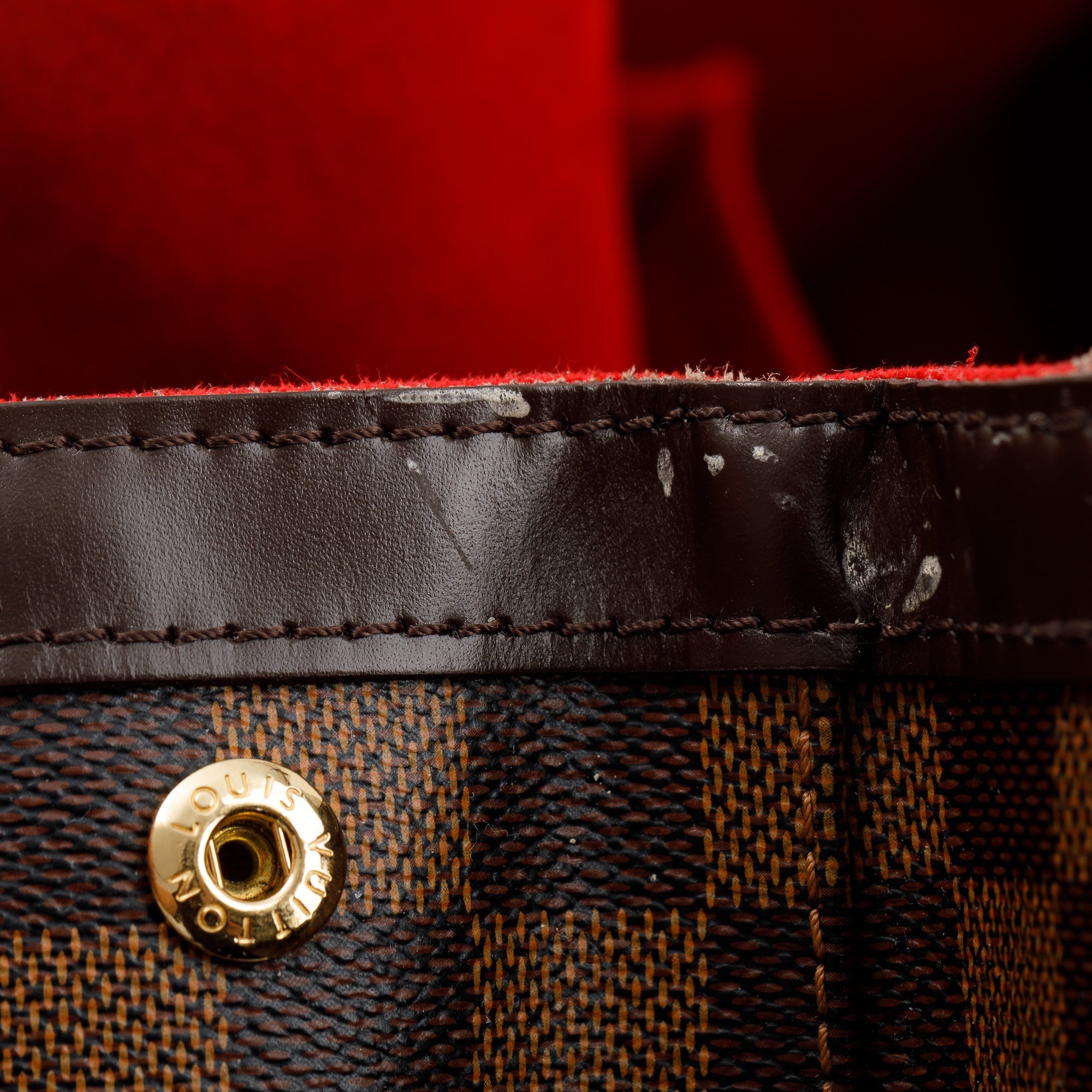 Condition: Very Good; slight scratches at hardware; slight scuffing at top edges; slight scratches at exterior leather trim; clean interior