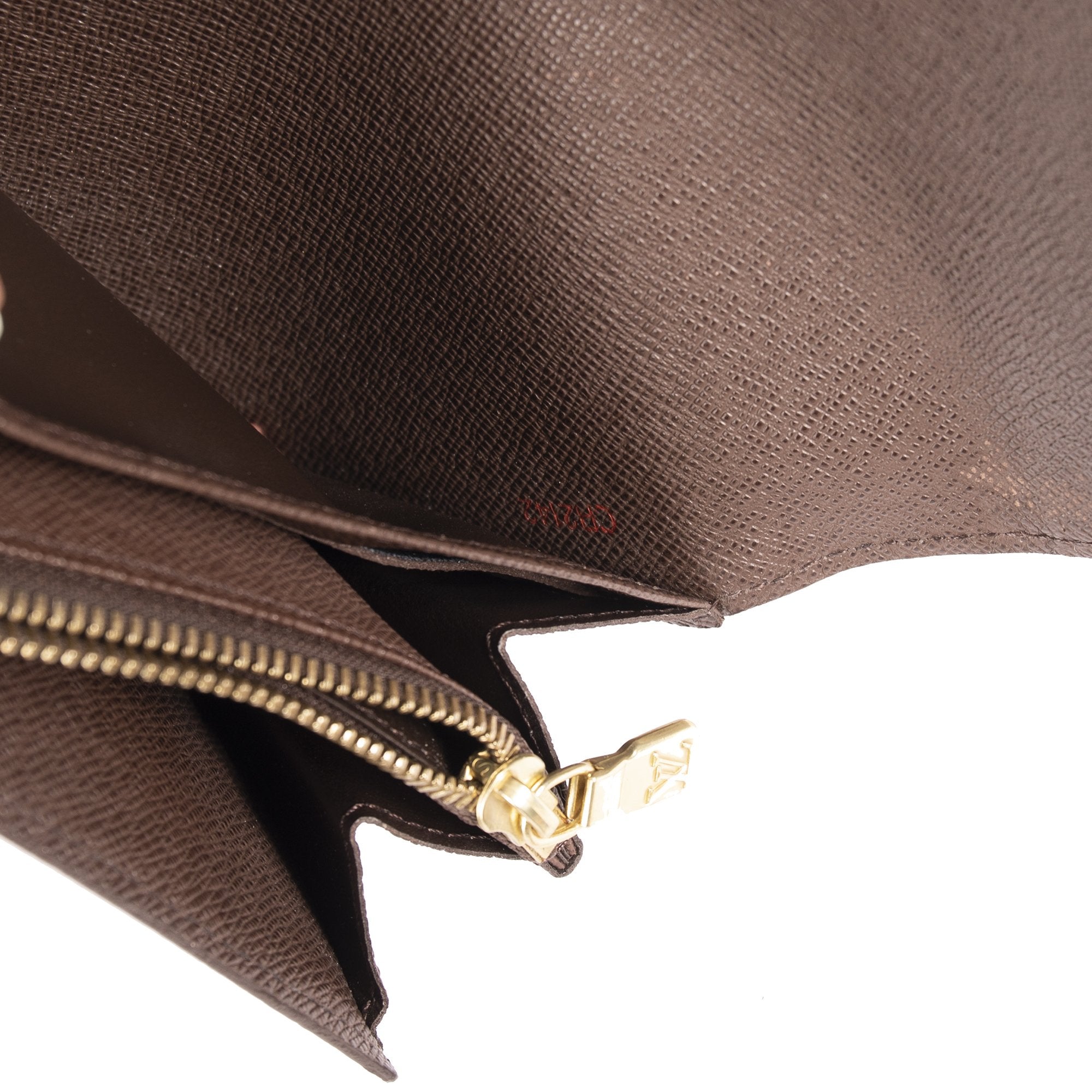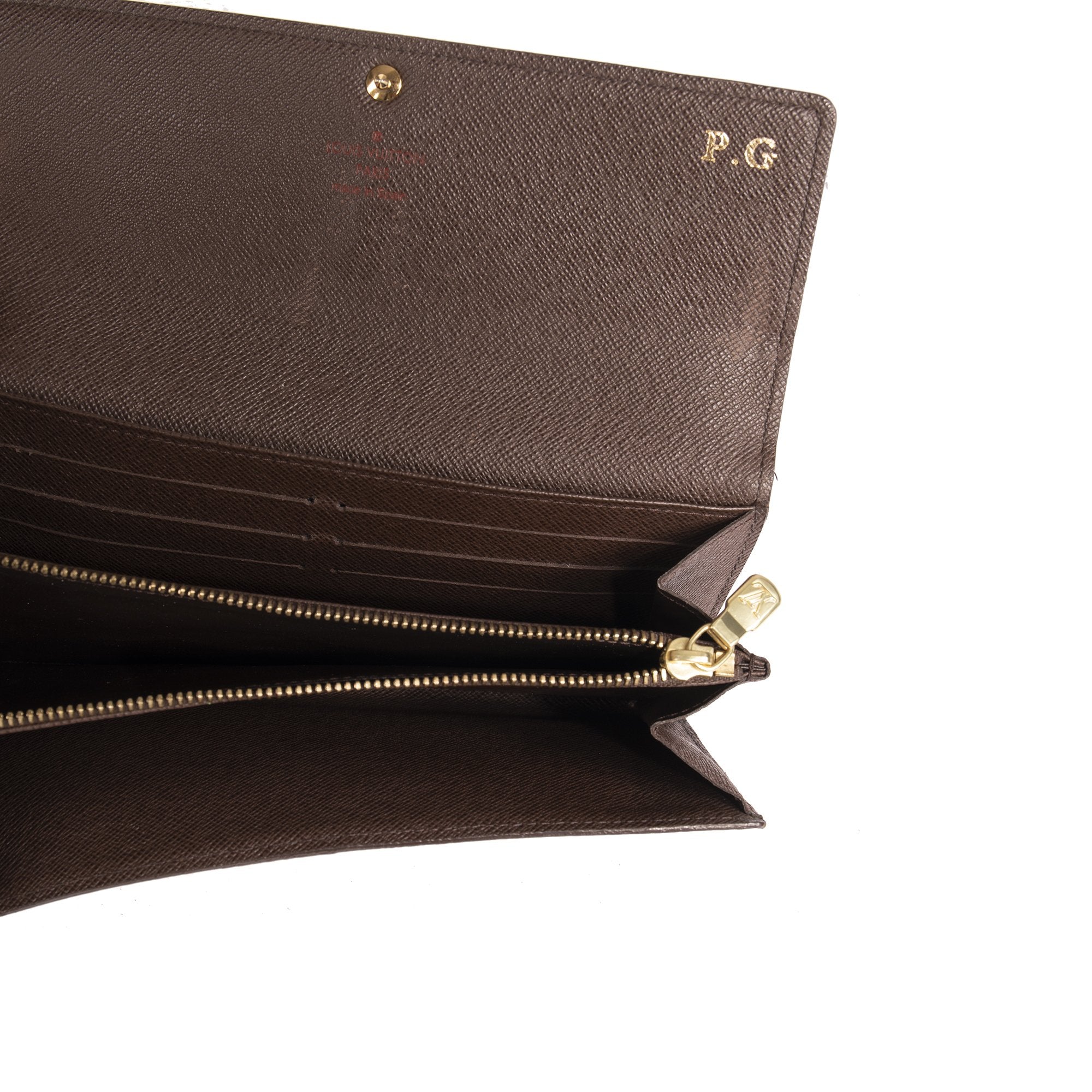 Condition: Very Good; light scratches and tarnishing at hardware; slight scuffs at interior leather flap underside; slight creasing at interior card slots; 'P.G' Initials Hot Stamped at interior