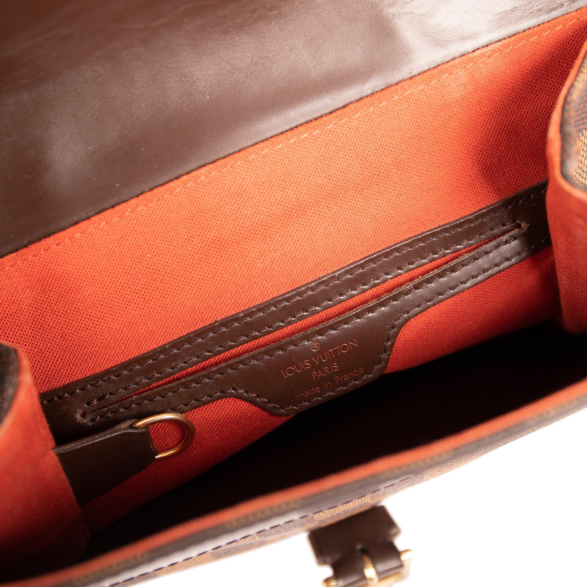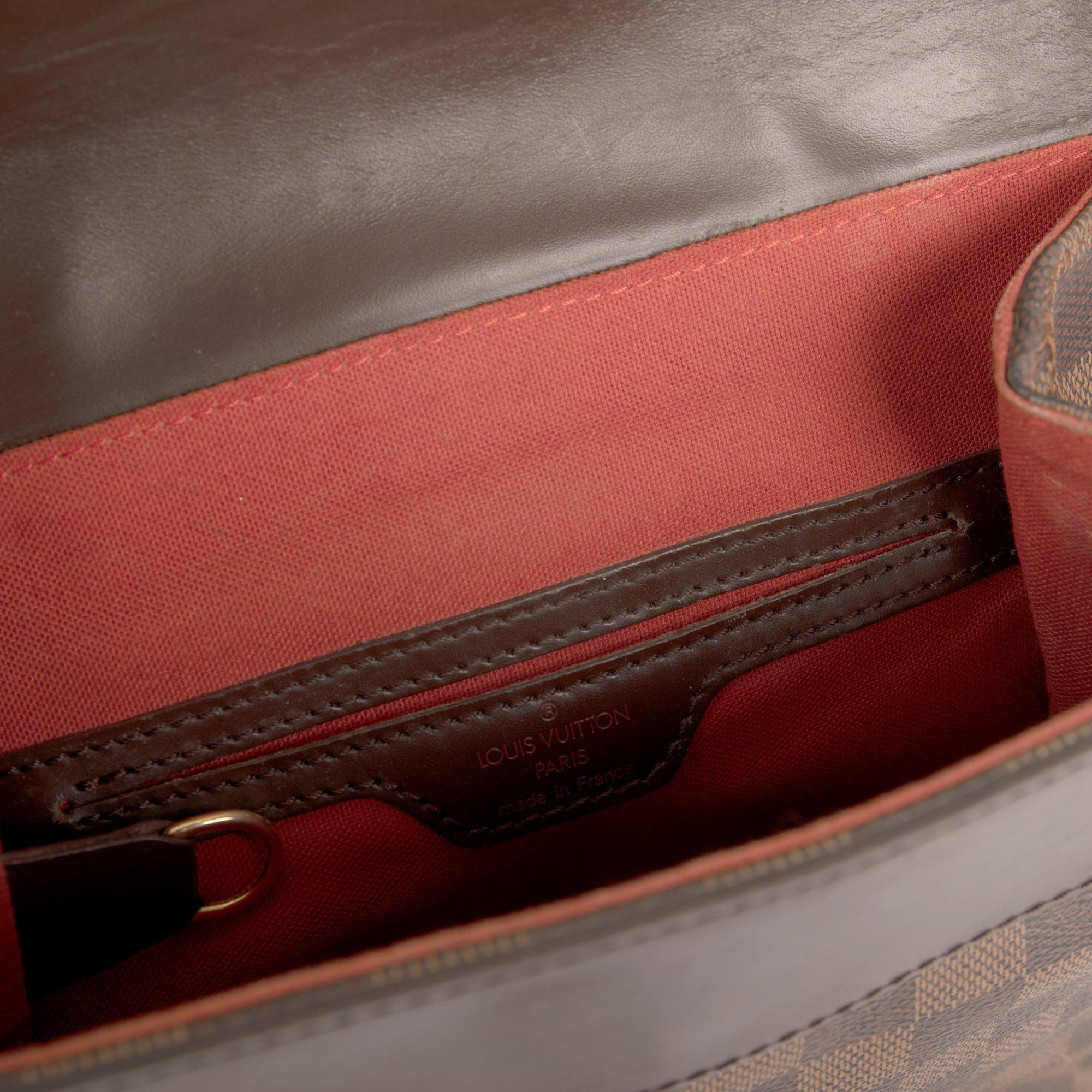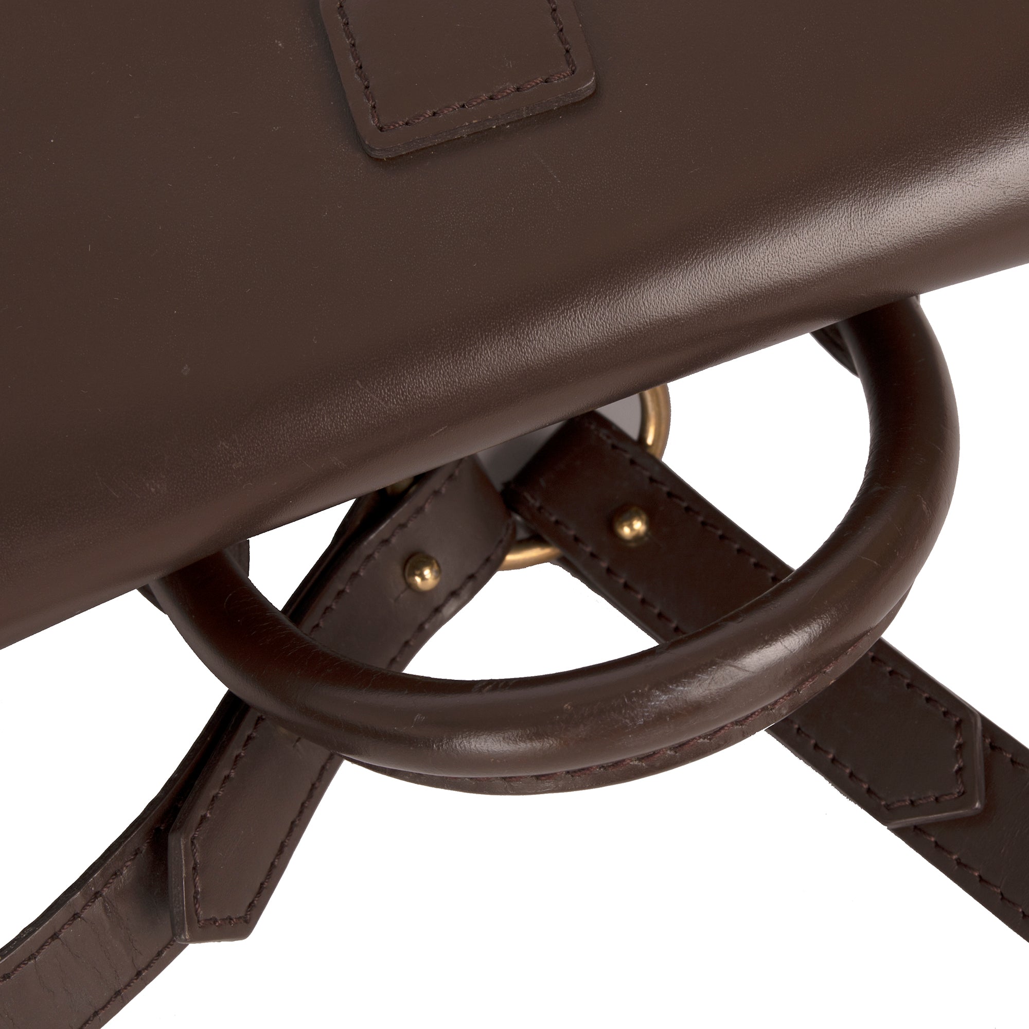 Condition: Good; some surface scratches and tarnishing at hardware; slight scratches and scuffing at exterior leather trim; slight creasing at leather trim shoulder straps; clean interior