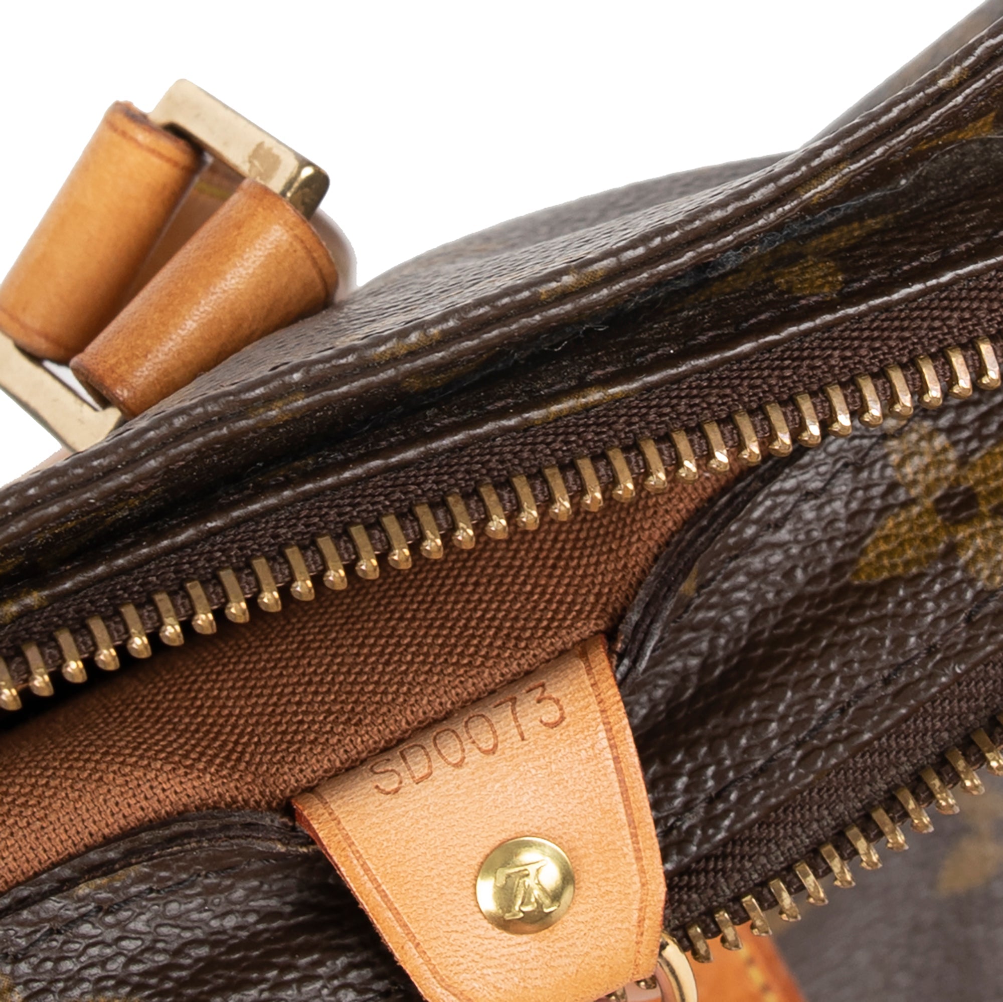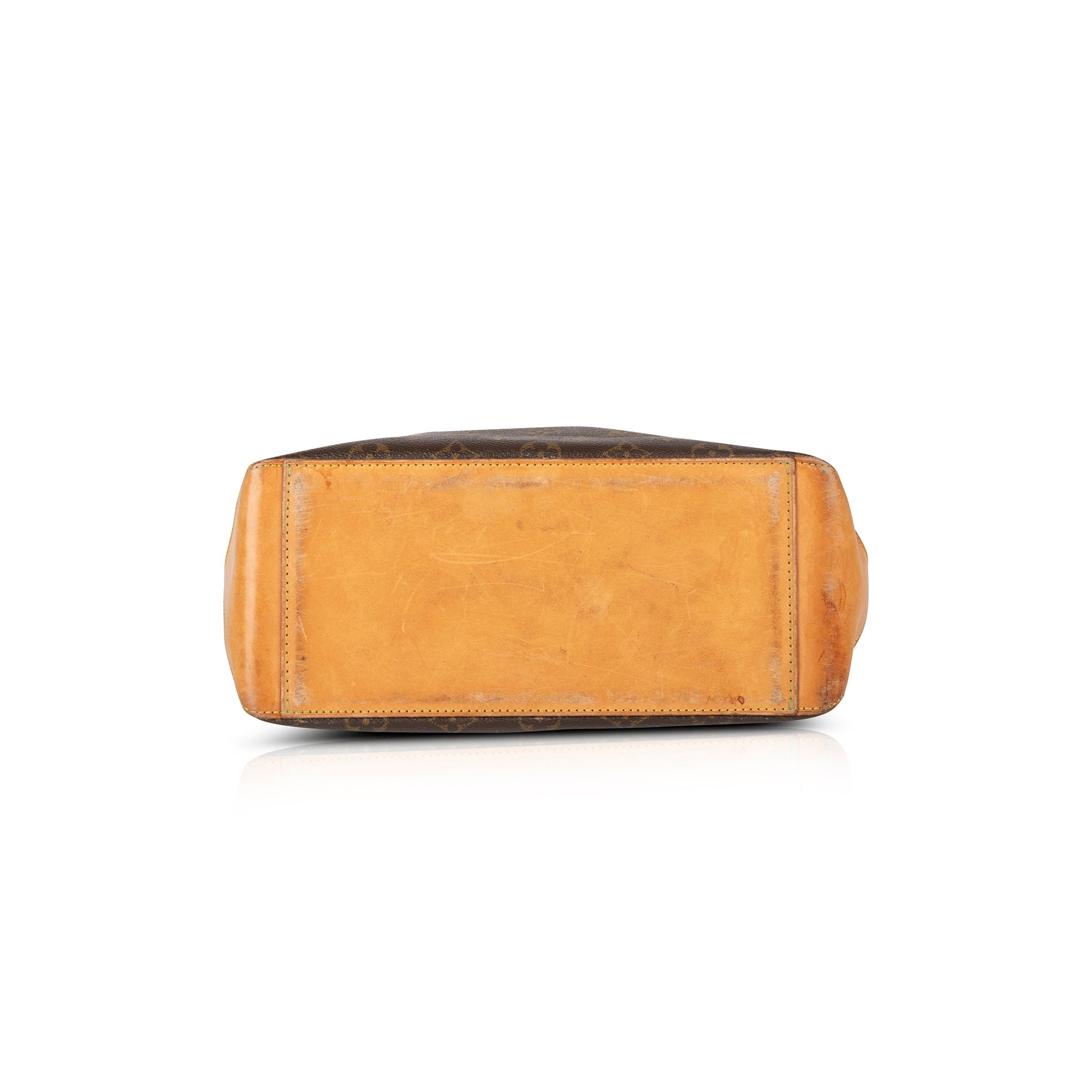 Condition: Fair; some surface scratches and tarnishing at hardware; moderate marks, scratches, and discolouration at exterior leather trim and shoulder straps; slight ink marks at interior lining
