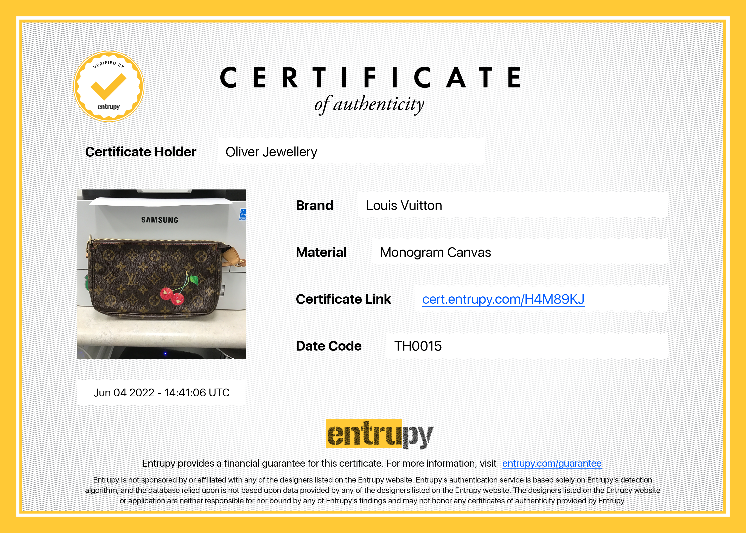 Included Items: Original Louis Vuitton Dust Bag & Entrupy Certificate of Authenticity #: H4M89KJ