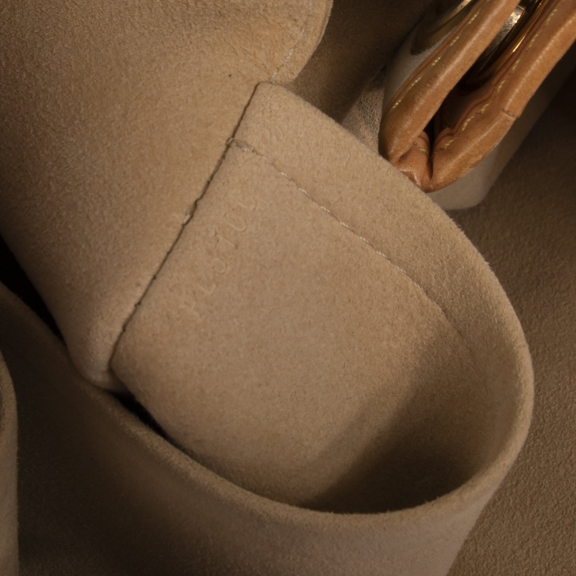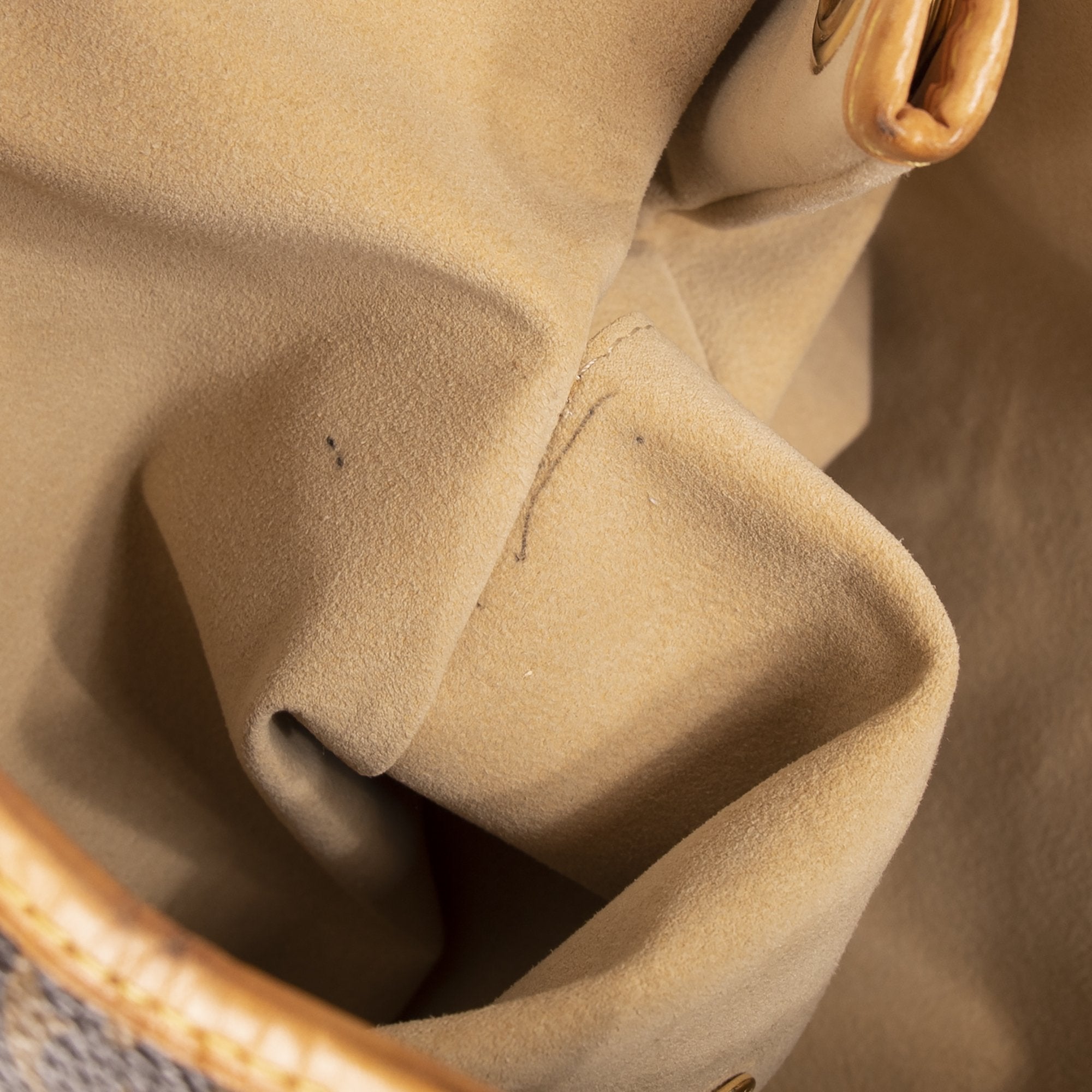 Condition: Good; some surface scratches at hardware; moderate scuffing and discolouration of exterior leather trim and shoulder strap; slight ink staining at interior