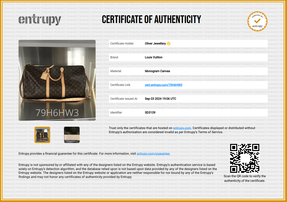 Dust Bag, Strap, Luggage Loop, ID Tag, Lock & Keys, Entrupy Certificate of Authenticity