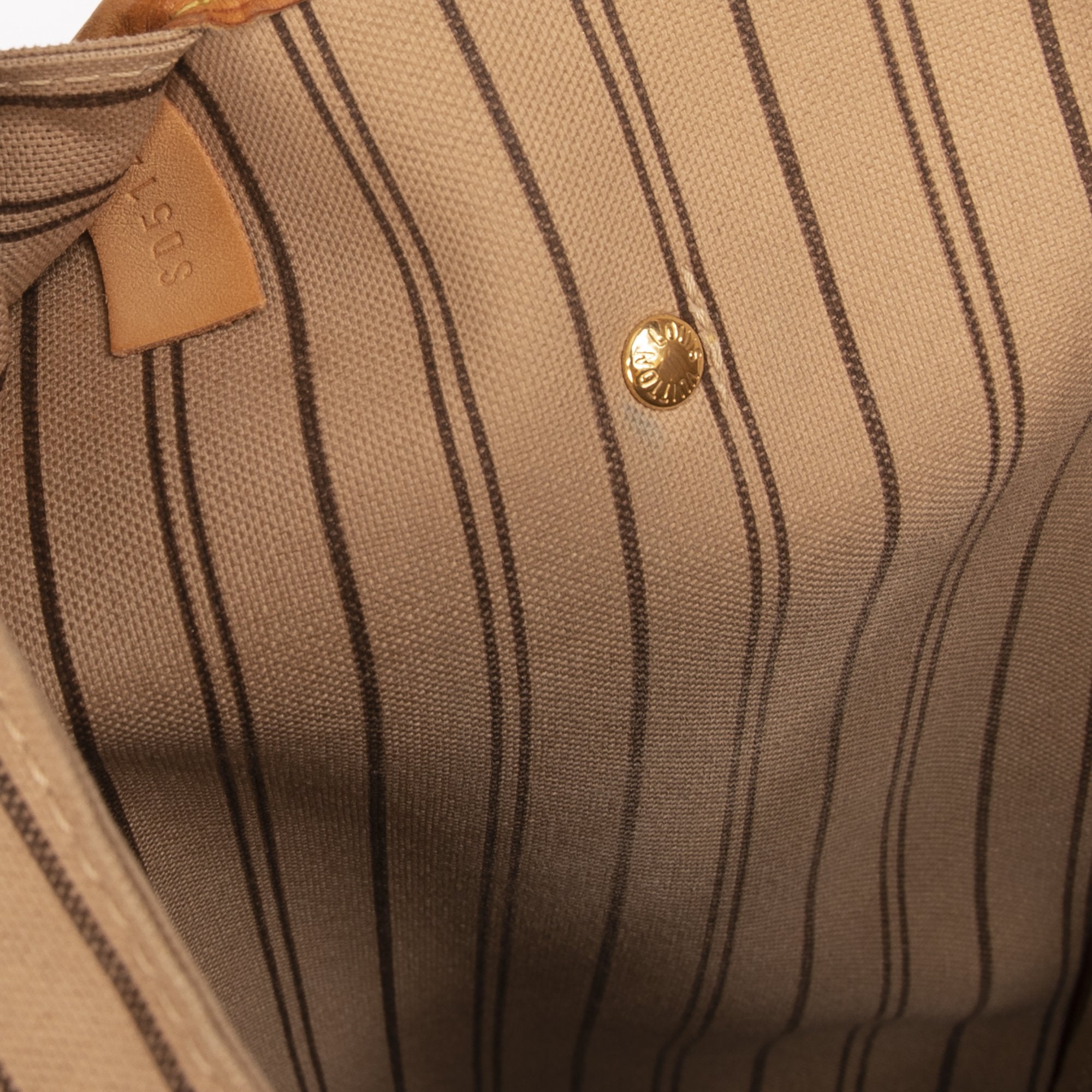 Condition: Good; some water marks and discolouration at exterior vachetta leather trim and shoulder straps; slight scuffing at bottom corners; clean interior
