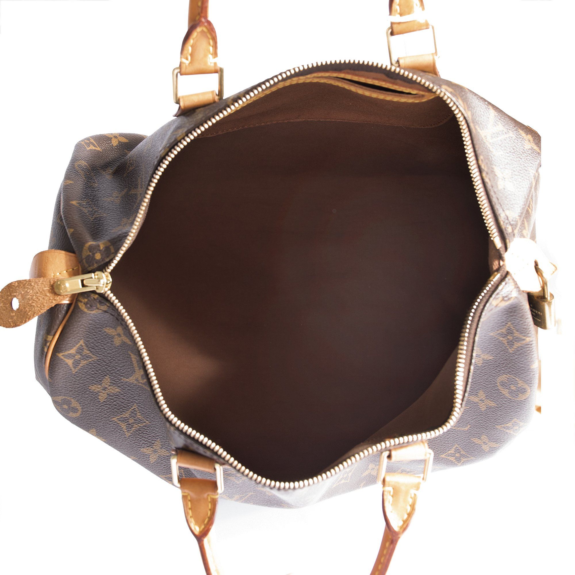 Condition: Very Good; some surface scratches at hardware; slight scuffs and discolouration of exterior leather trim and handles; clean interior