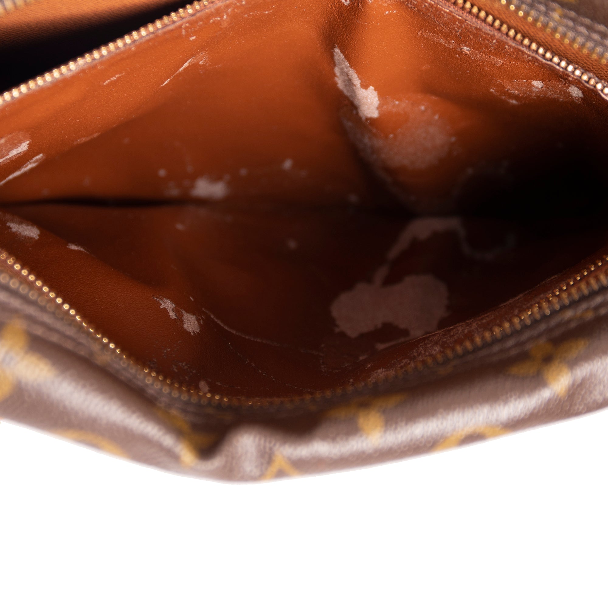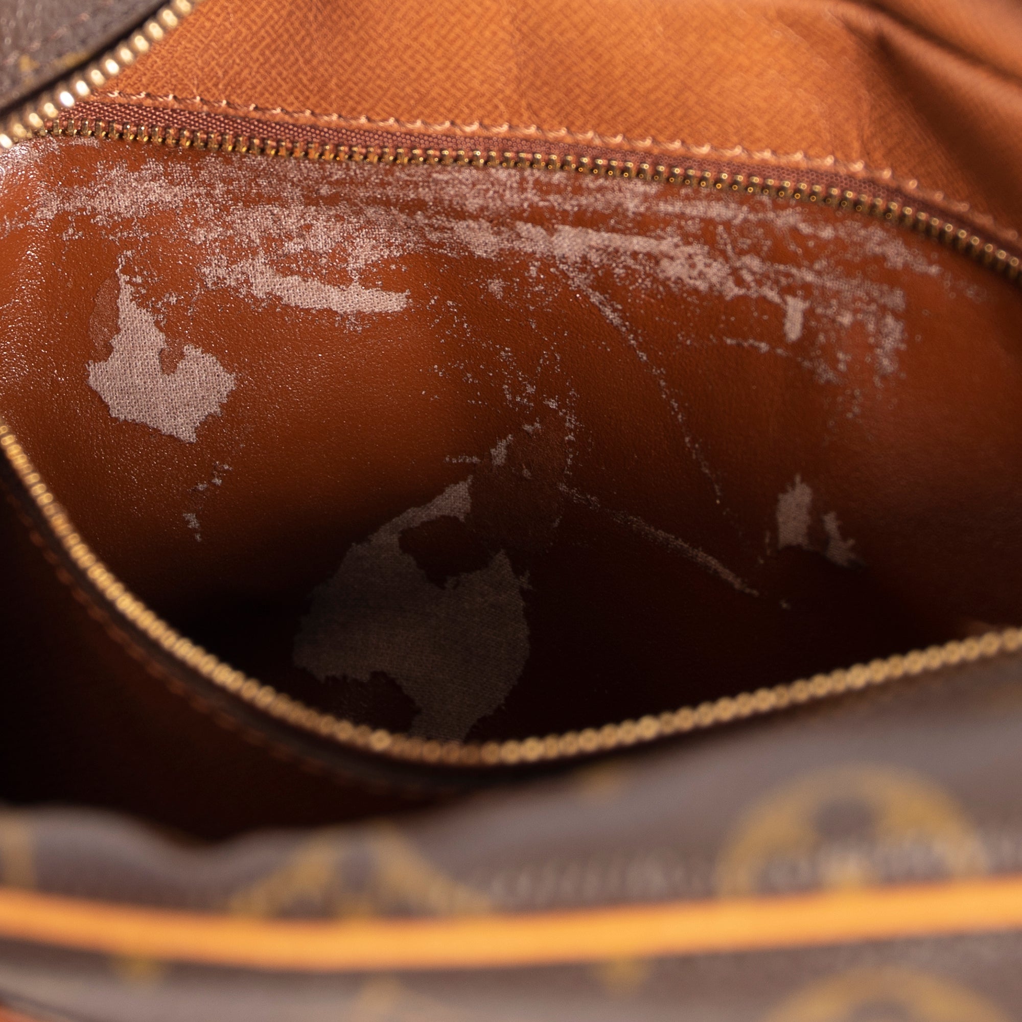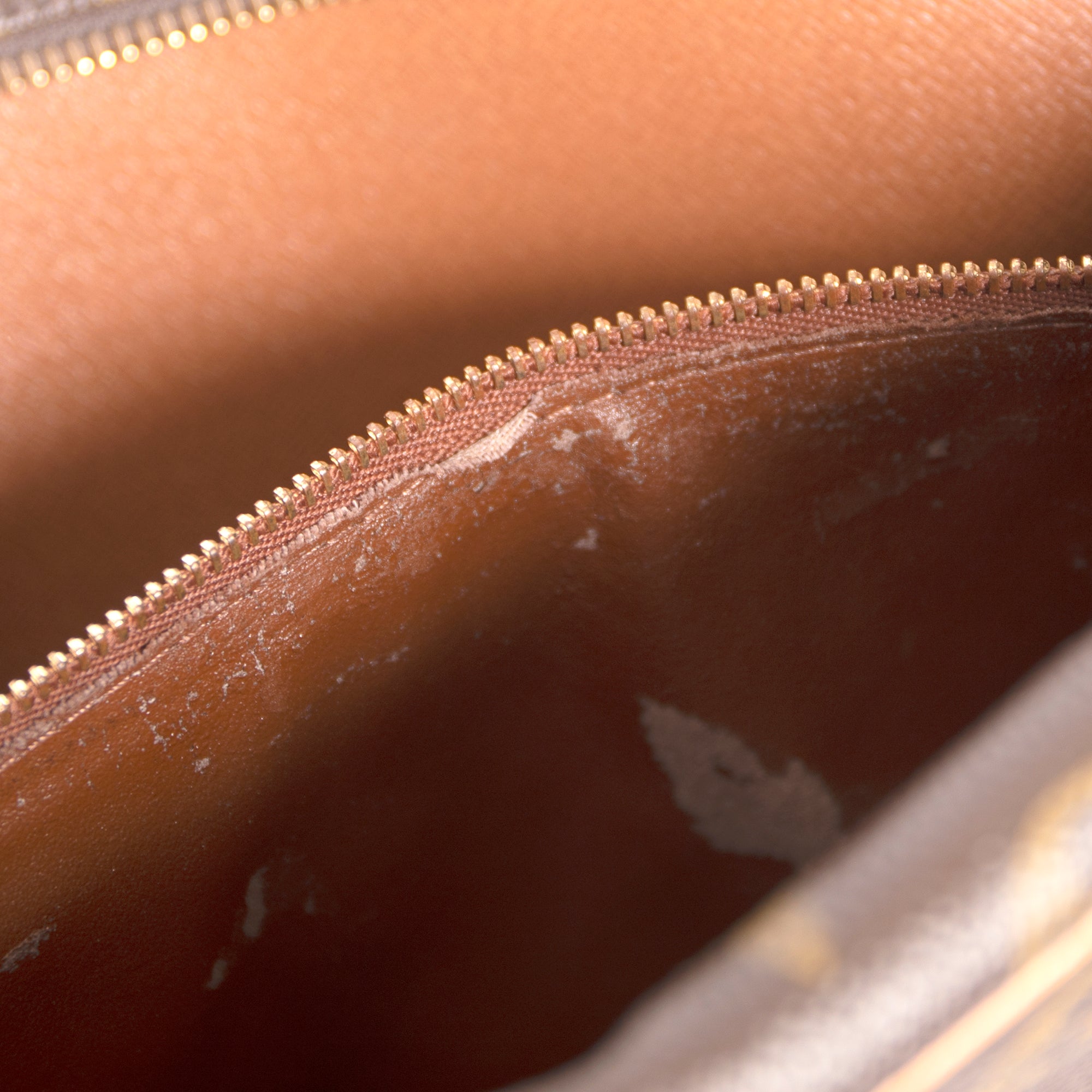 Condition: Fair; some surface scratches and tarnishing at hardware; some marks and discolouration at exterior vachetta leather trim and shoulder strap; moderate peeling at interior pockets