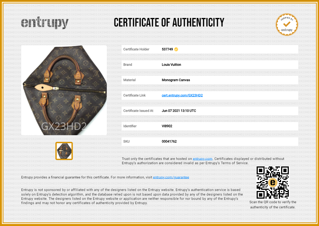 Entrupy Certificate of Authenticity