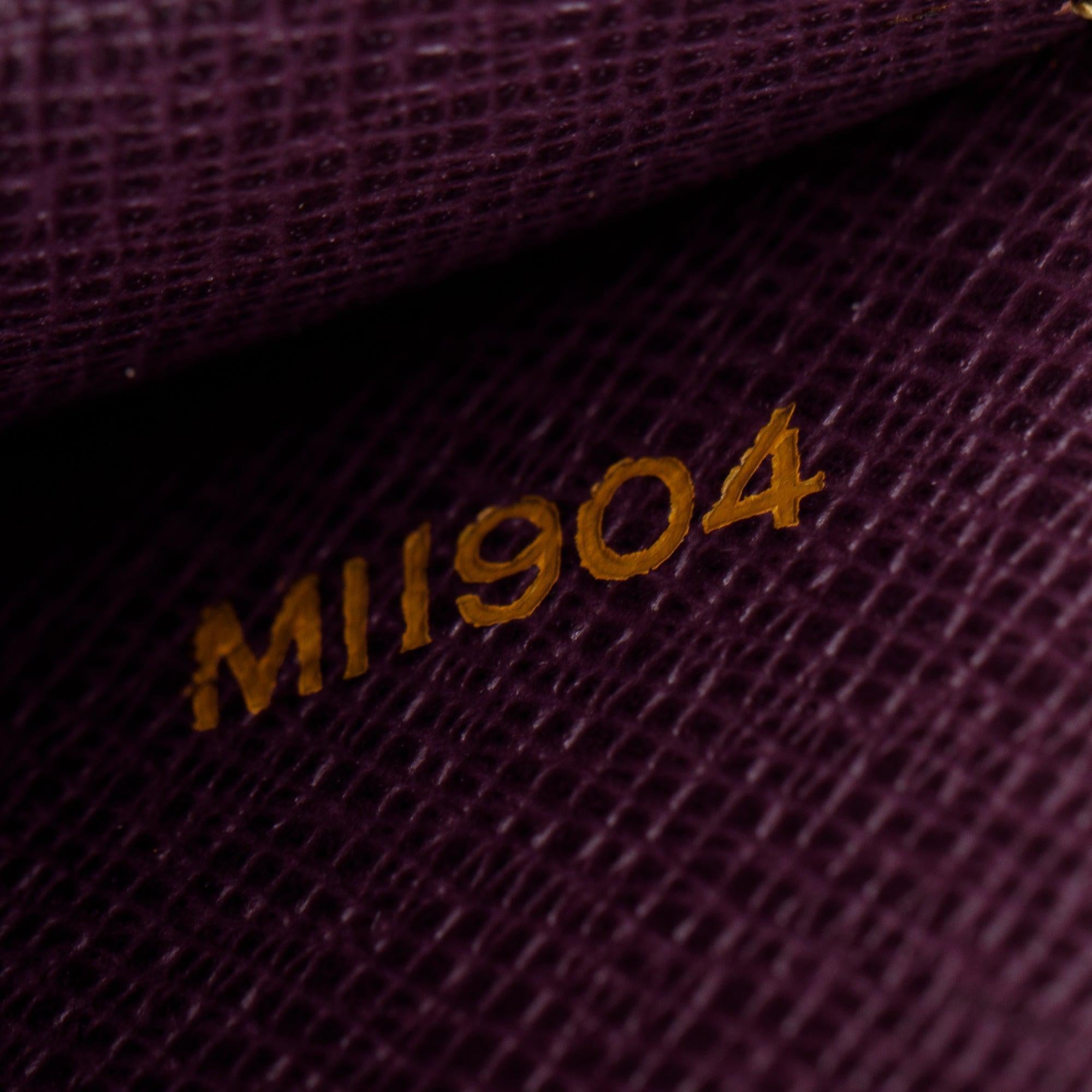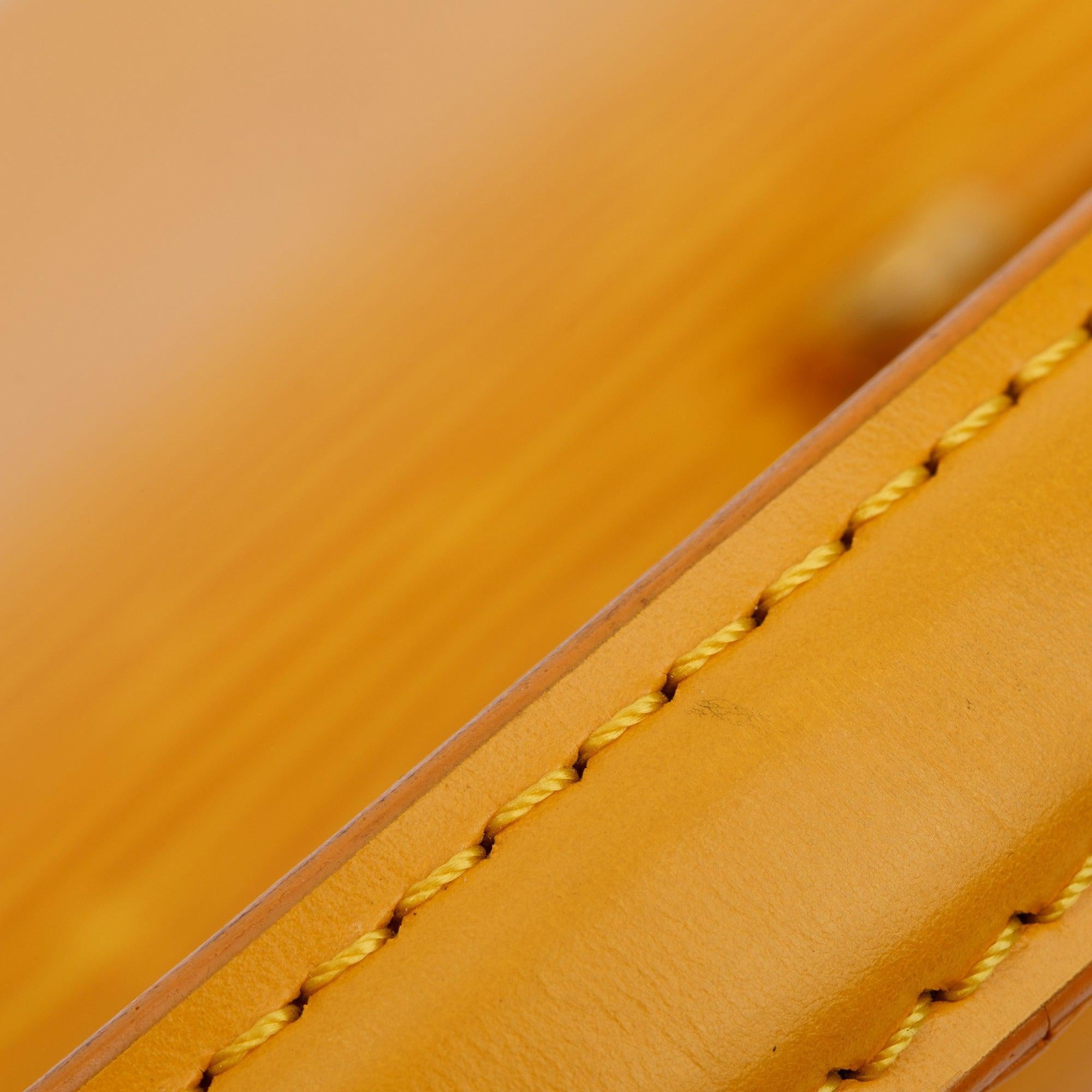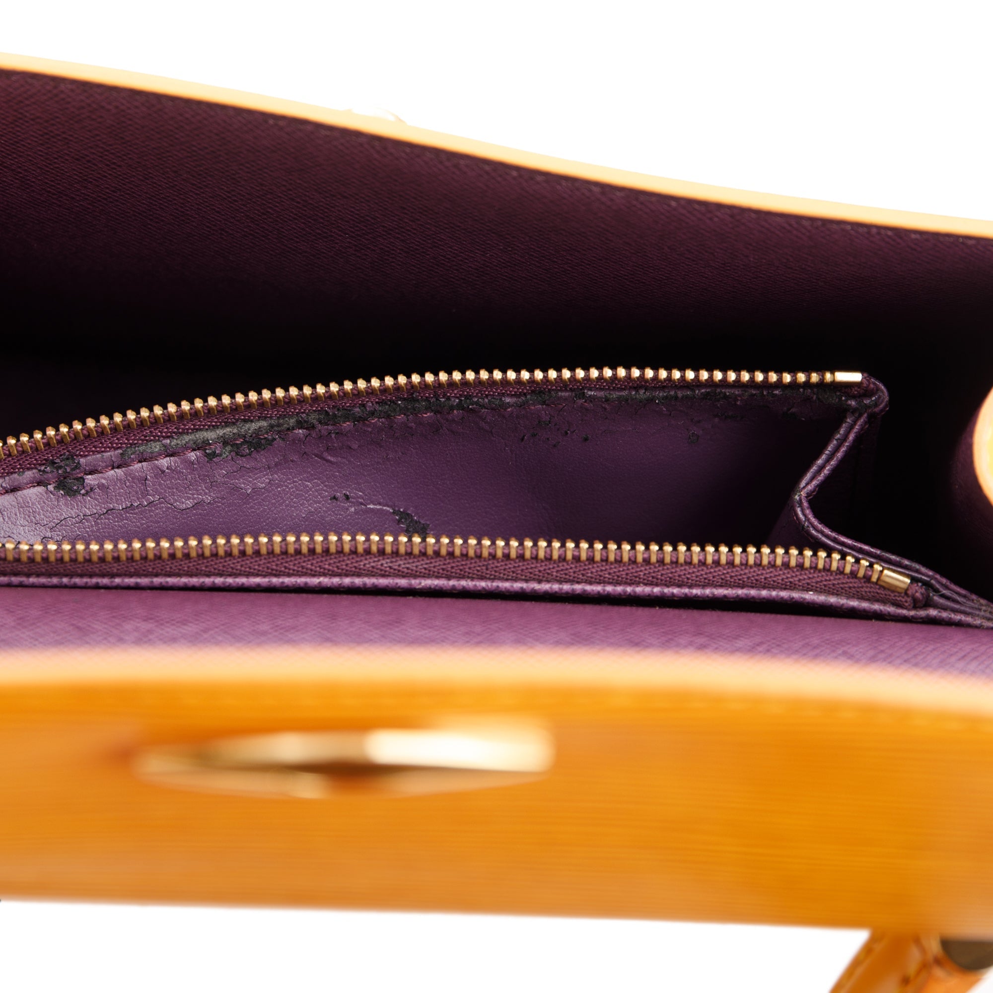 Condition: Good; minor scratches at hardware; slight creasing and wear at top handle; slight peeling at exterior pocket