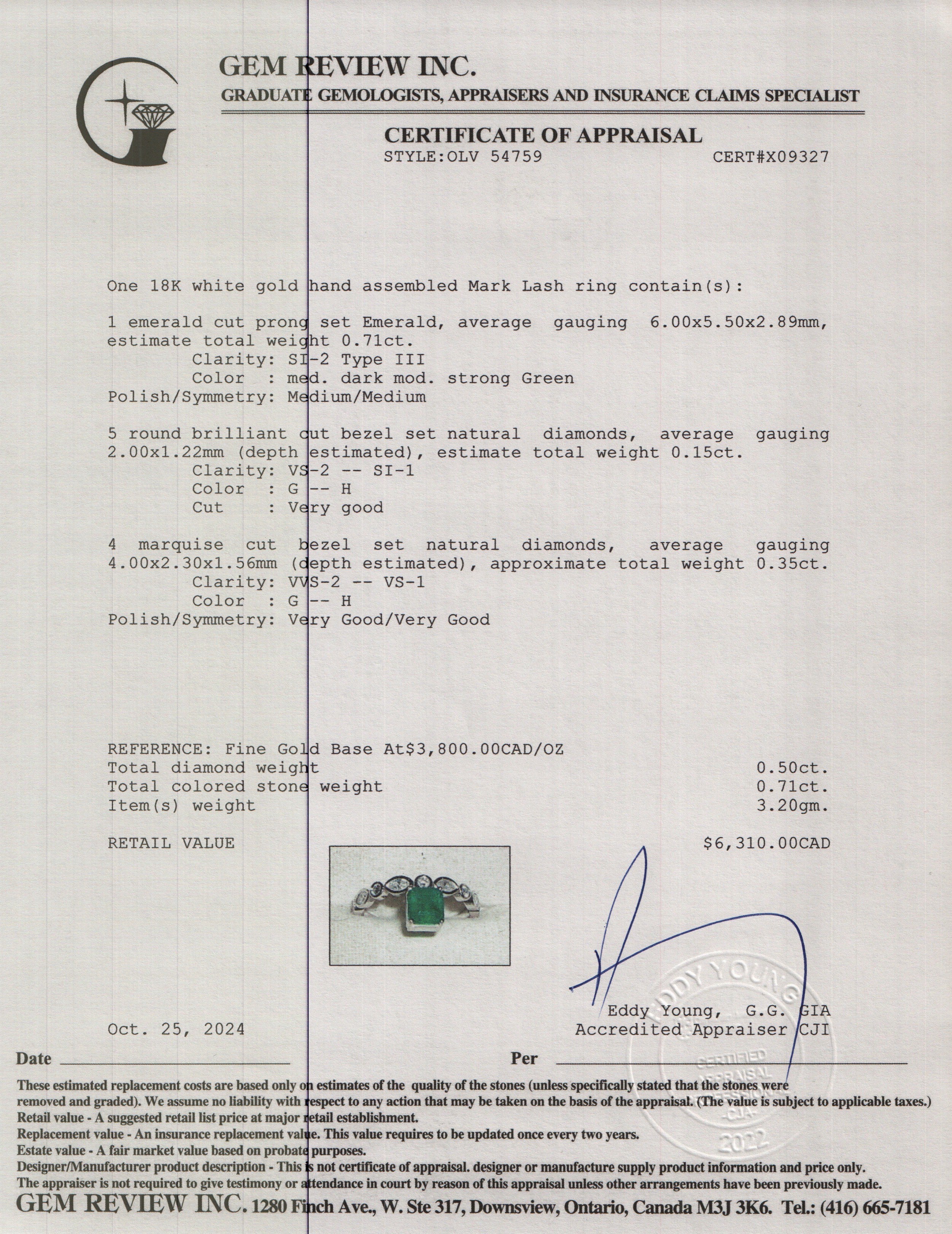 Mark Lash 18k White Gold Emerald & Diamond Ring, Size 7