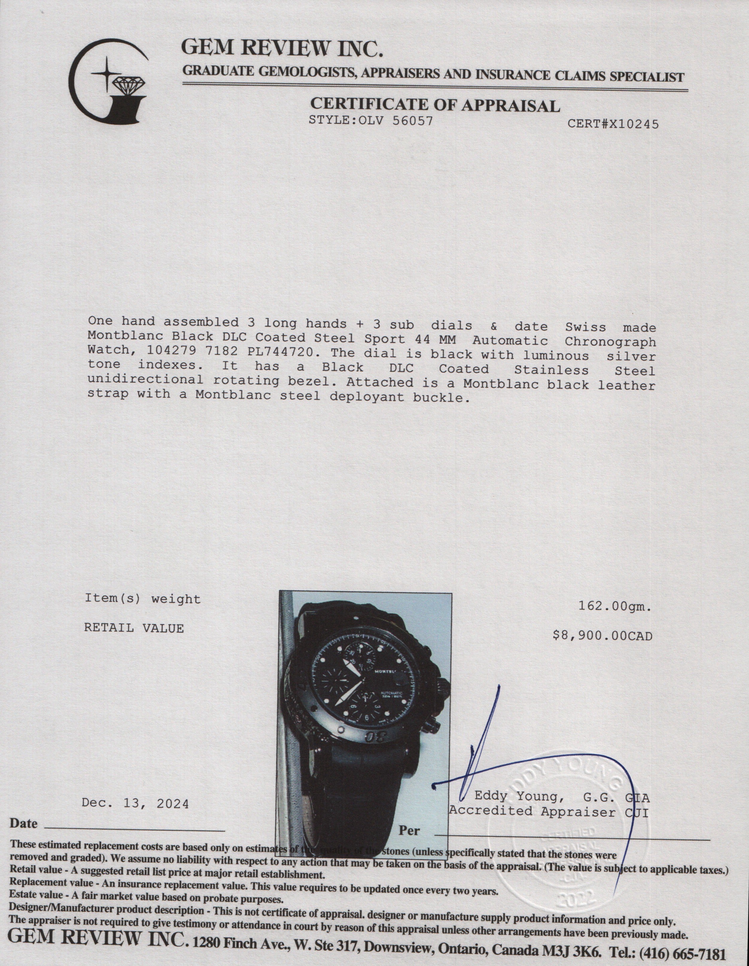 Black DLC Coated Stainless Steel Sport 44 MM Automatic Chronograph Watch, w/ Box & Receipt