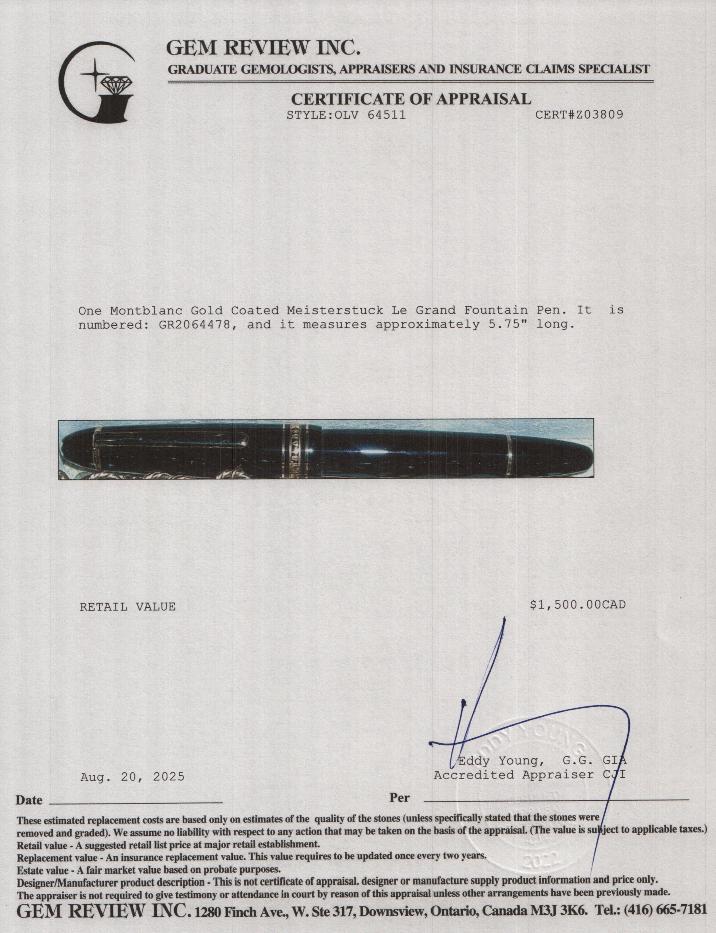 Gold Coated Meisterstuck Le Grand Fountain Pen w/ Leather Carry Pouch & Ink Refills