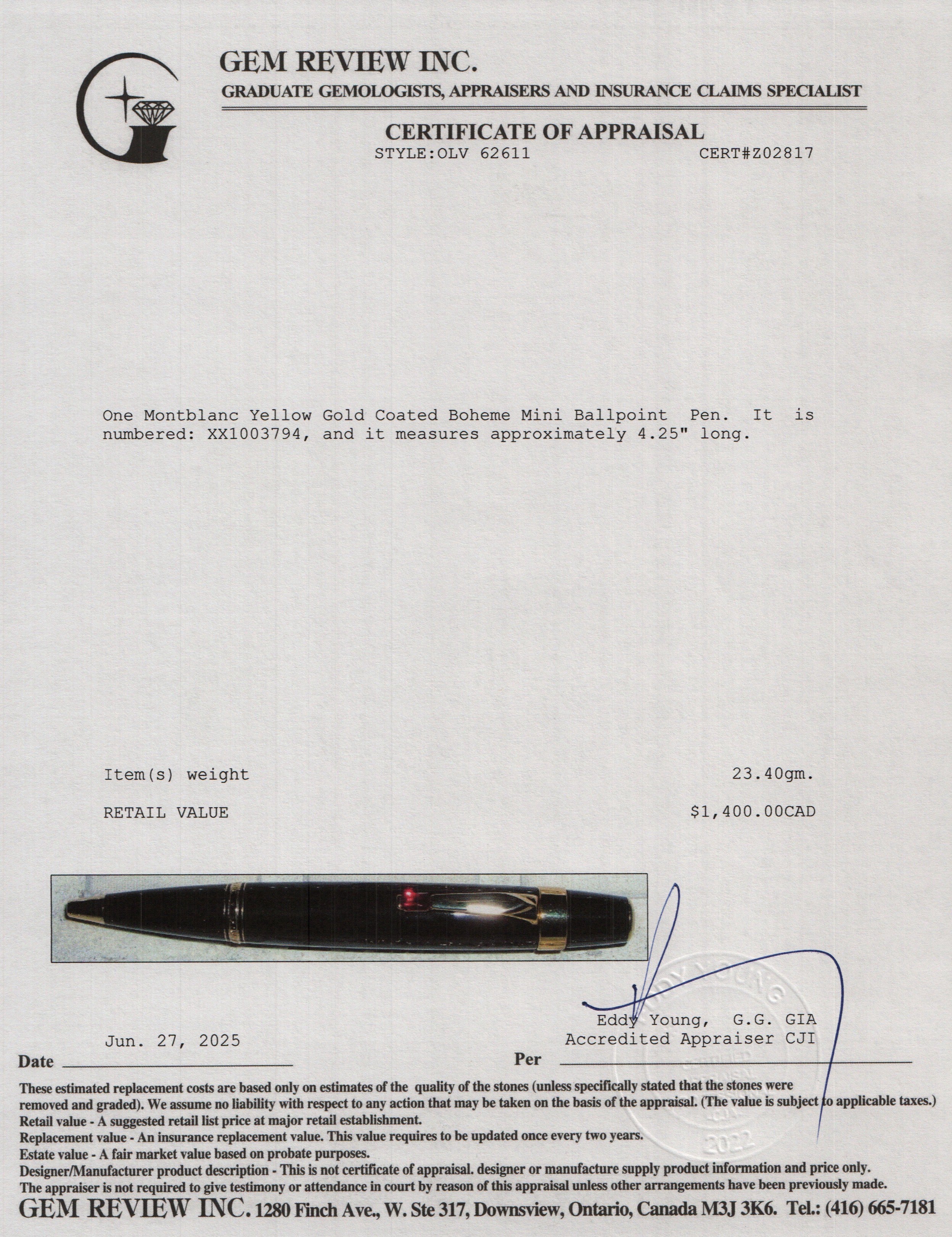 Yellow Gold Coated Boheme Mini Ballpoint Pen w/ Box