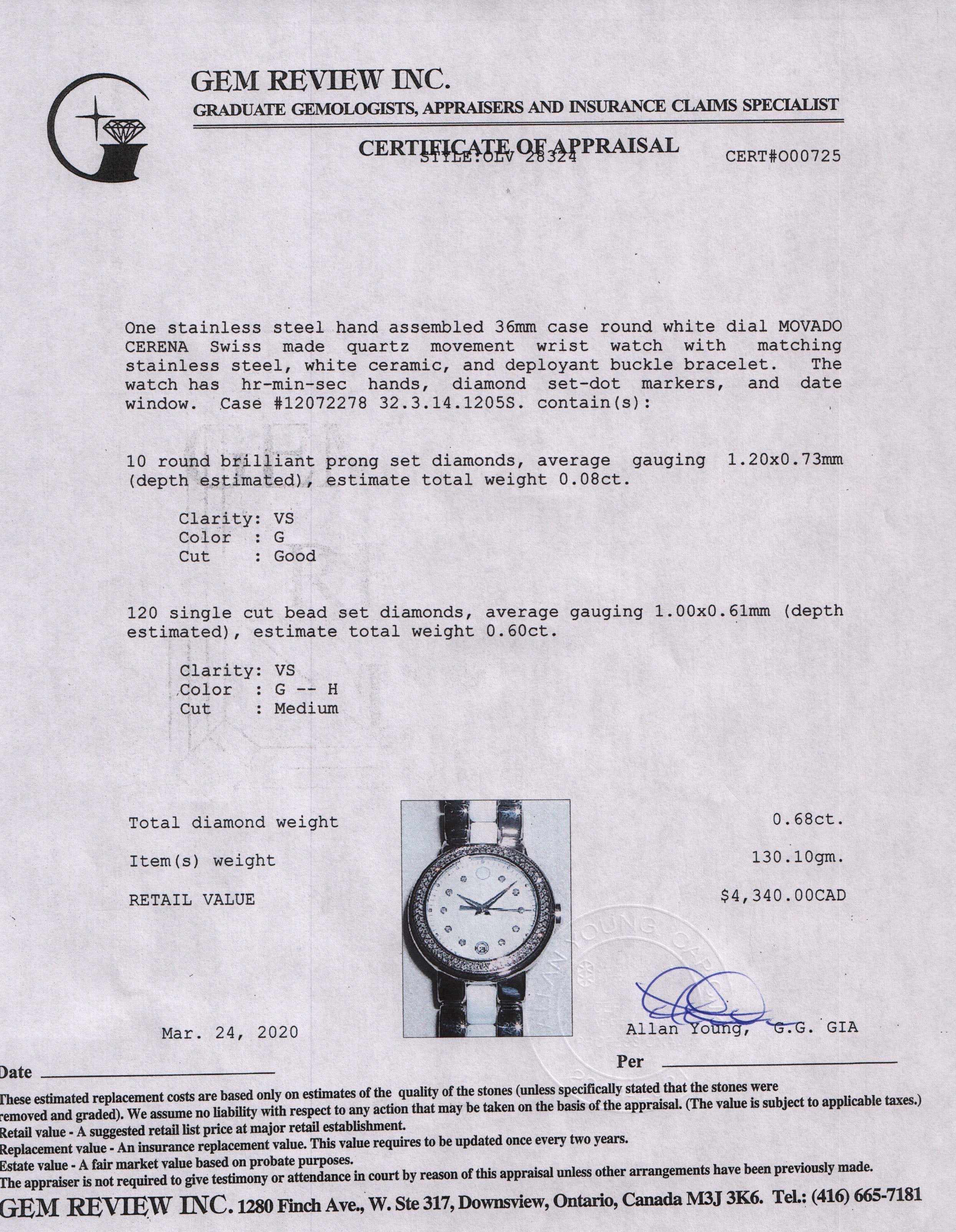 Included Items: Original Movado Box, Card, and Booklet and Gem Review Appraisal