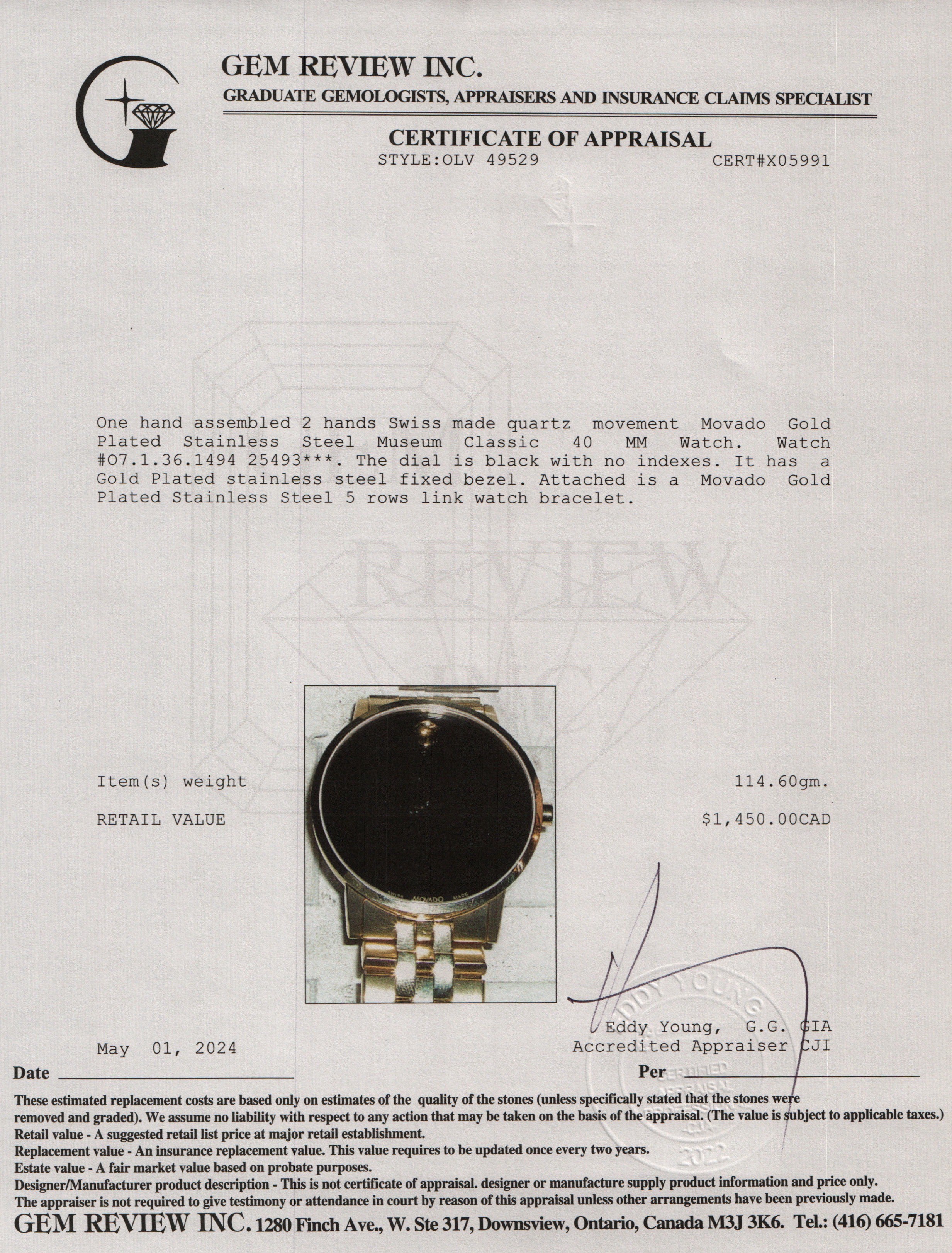 Gold Plated Stainless Steel Museum Classic 40 MM Watch w/ Box & Papers