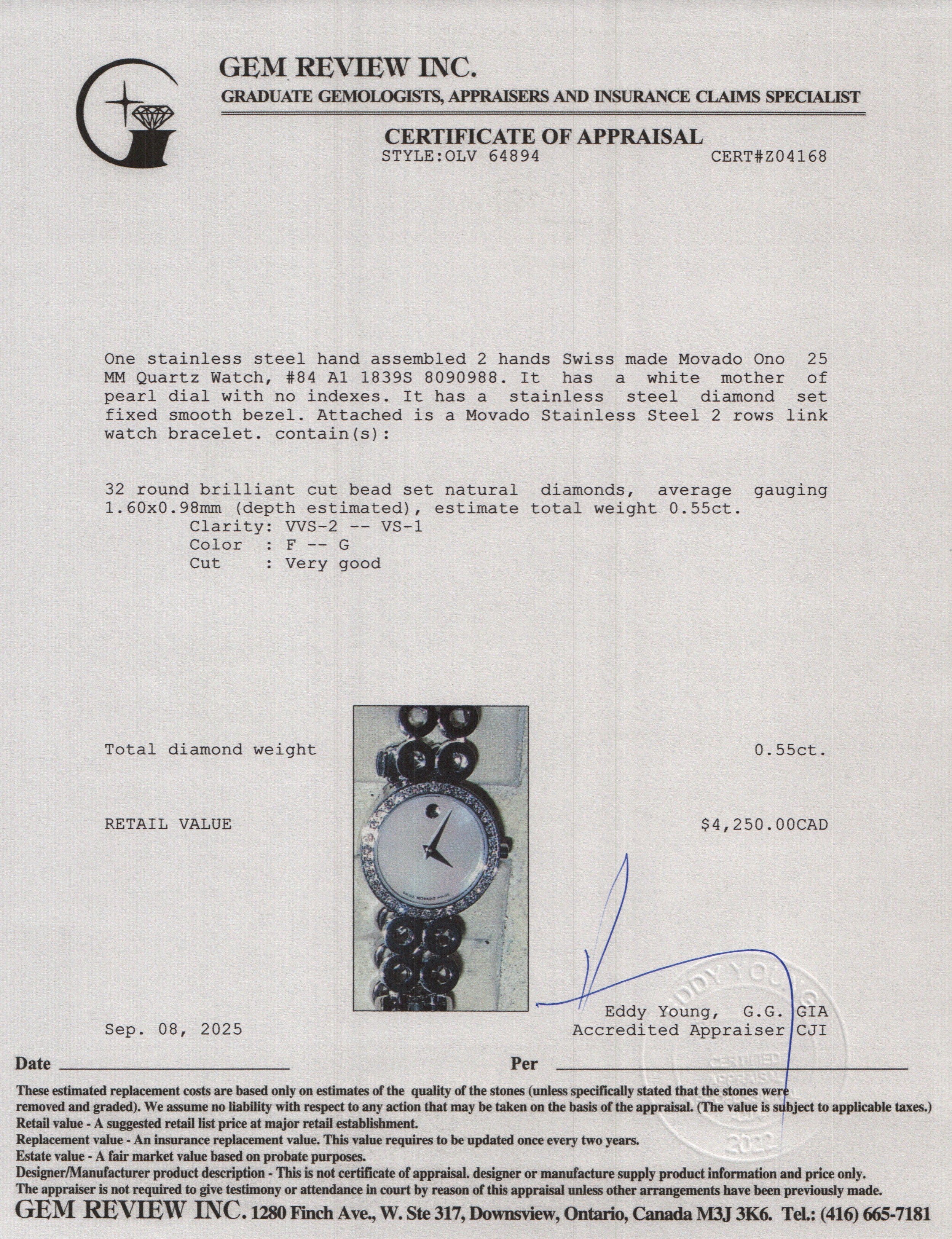Stainless Steel Diamond Bezel Ono 25 MM Quartz Watch Mother of Pearl Dial