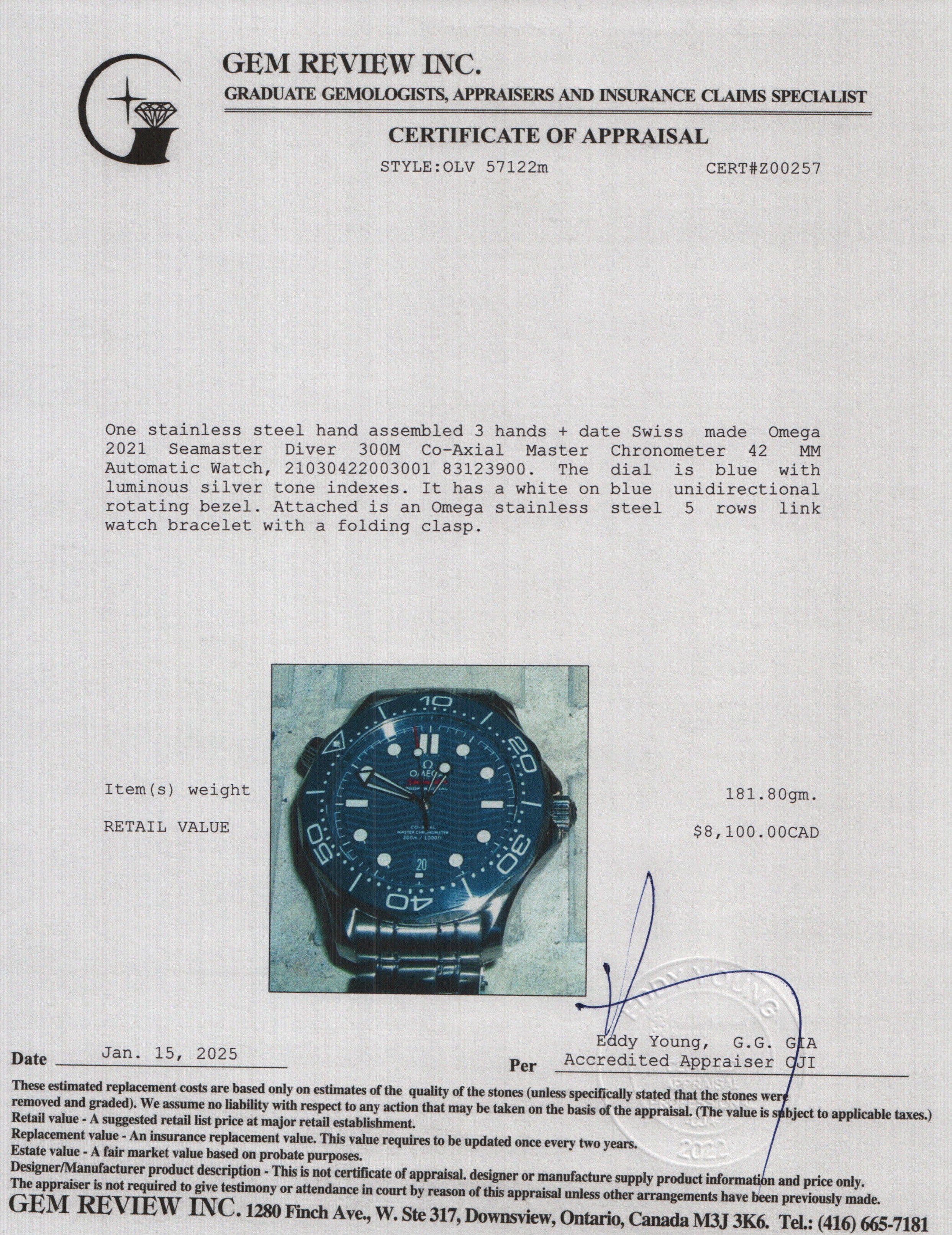 2021 Stainless Steel Seamaster Diver 300M Co-Axial Master Chronometer 42 MM Automatic Watch w/ Box, Papers & Extra Strap