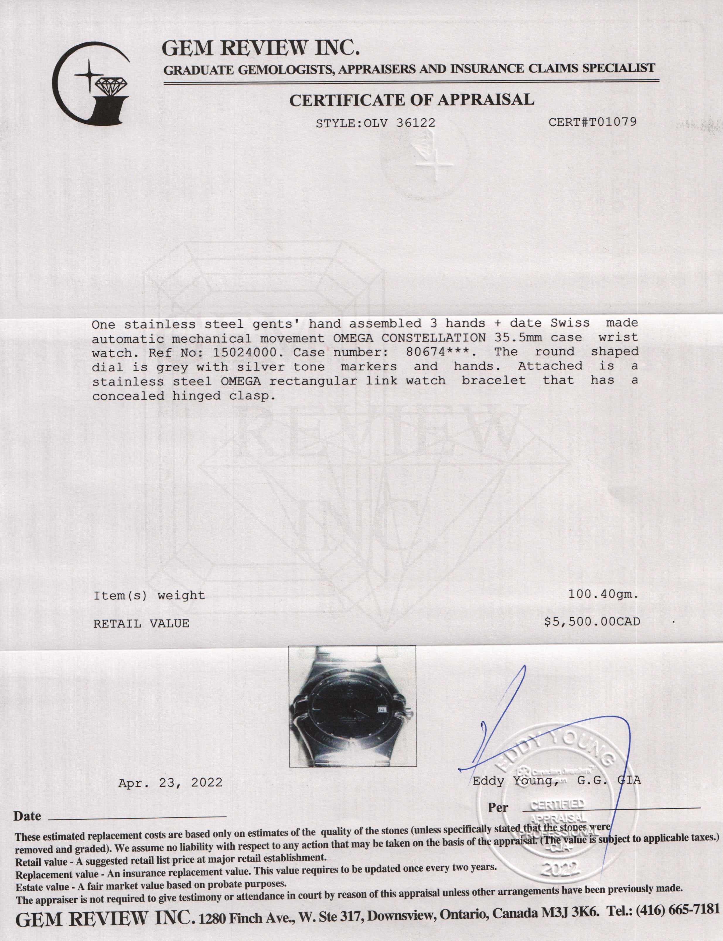 Included Items: Original Omega Box, Certificate Cards, Booklet & Gem Review Appraisal