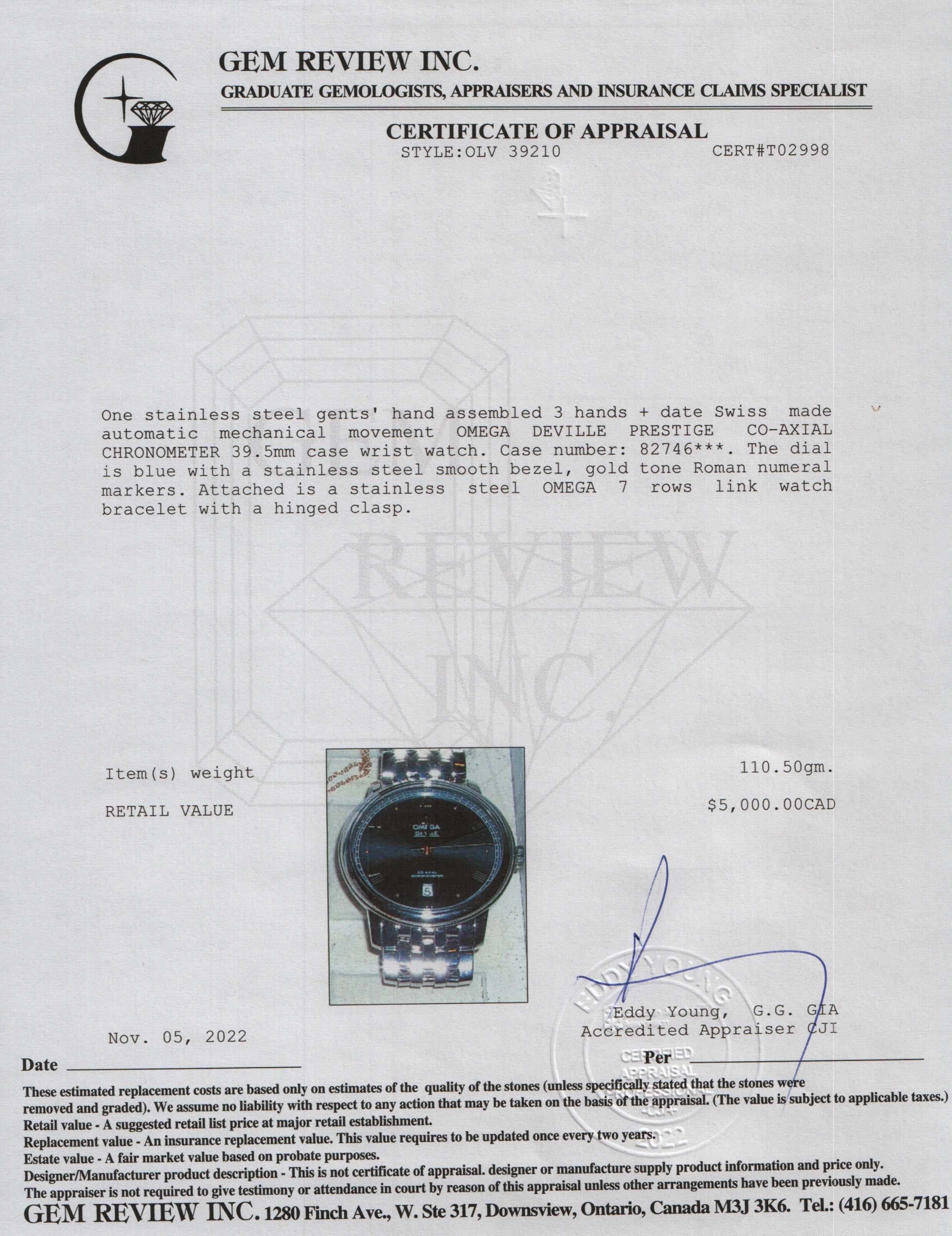 Included Items: Original Omega Box, Receipt, Warranty Card, Booklet, Tag and Gem Review Appraisal