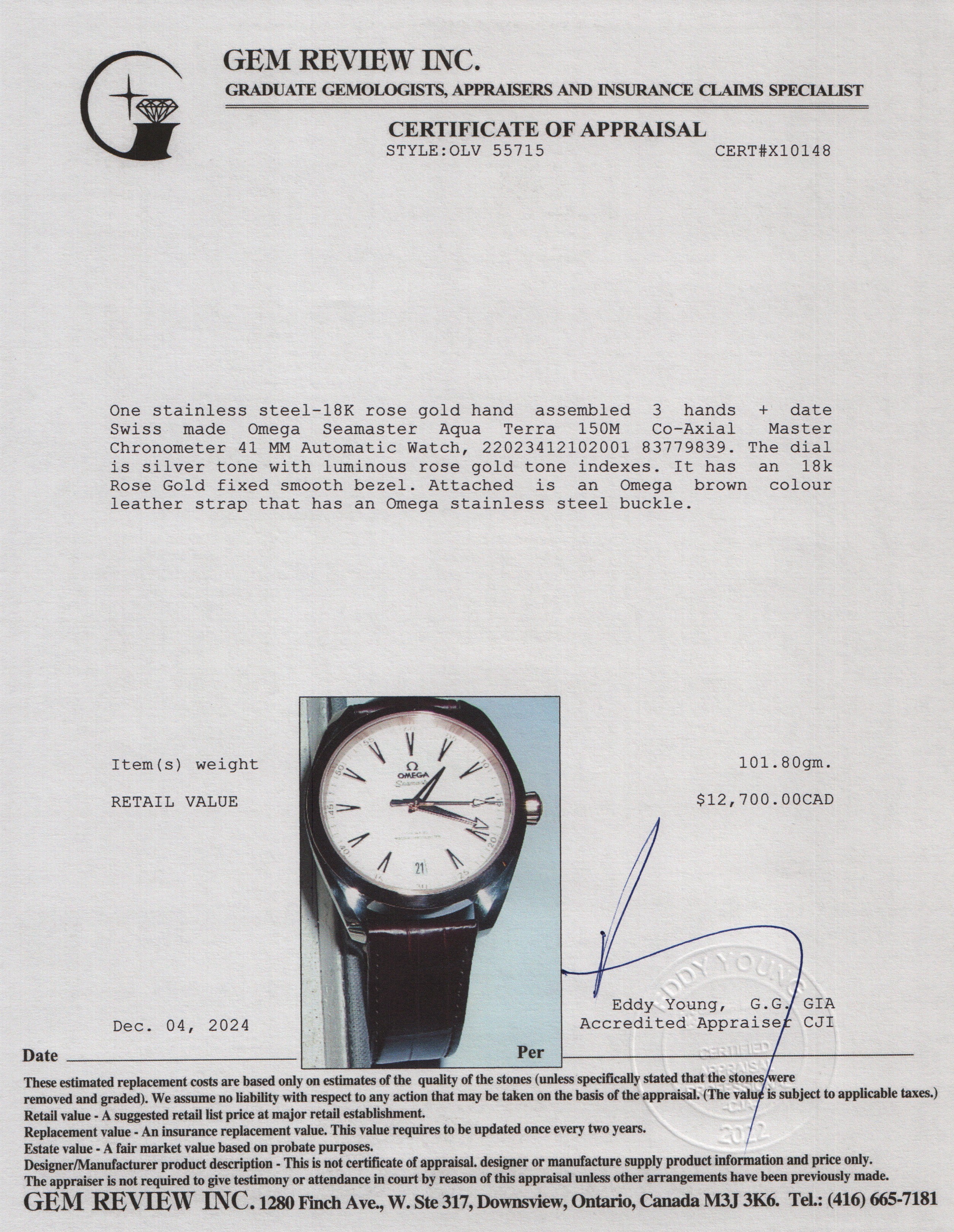 Stainless Steel & 18k Rose Gold Seamaster Aqua Terra 150M Co-Axial Master Chronometer 41 MM Automatic Watch w/ Box & Papers
