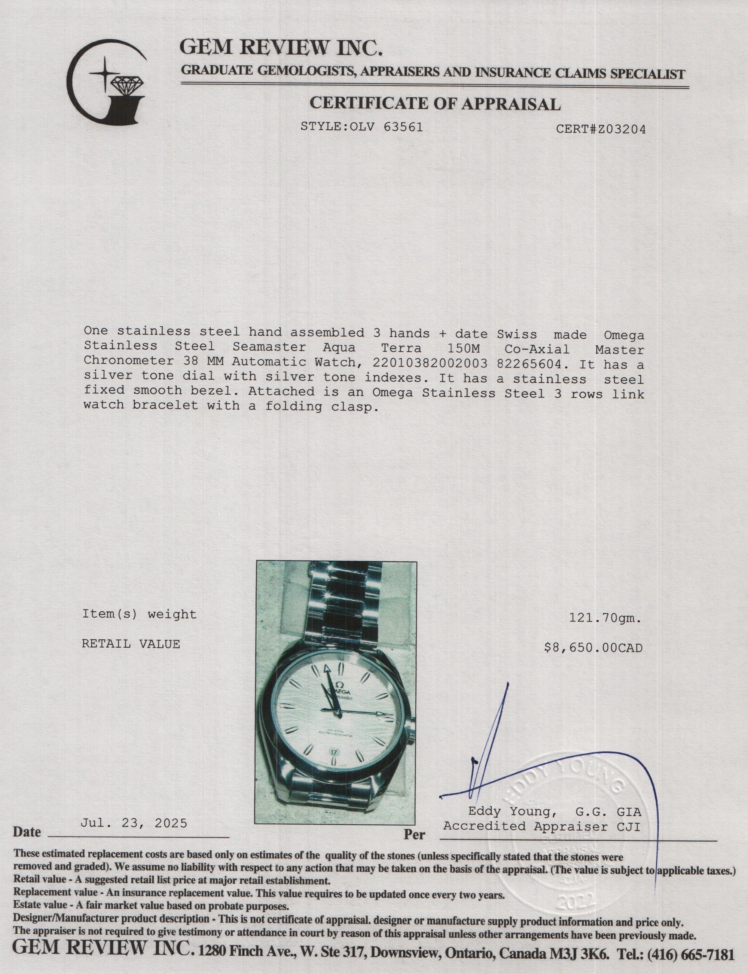 Stainless Steel Seamaster Aqua Terra 150M Co-Axial Master Chronometer 38 MM Automatic Watch Silver Dial w/ Box & Papers
