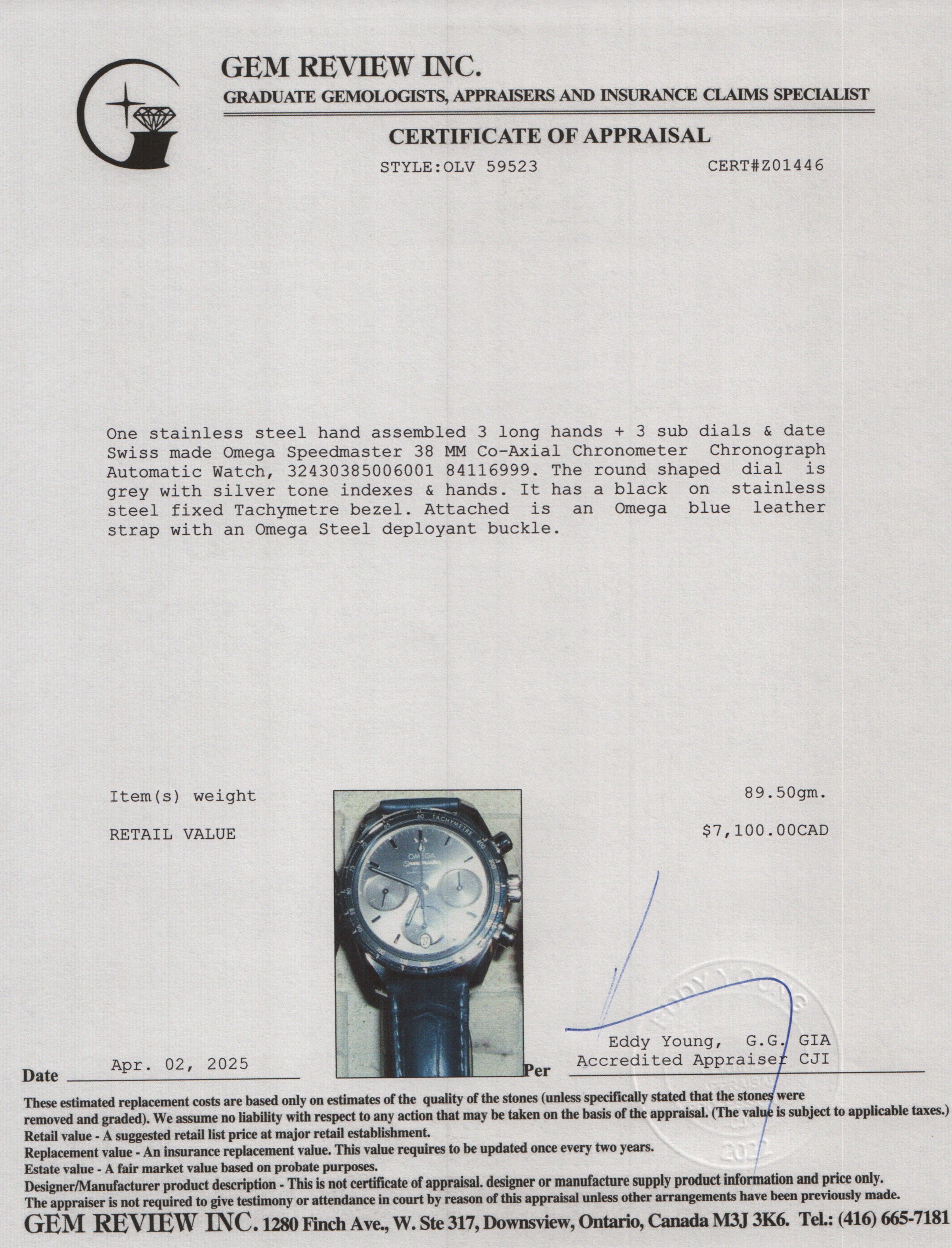 Stainless Steel Speedmaster 38 MM Co-Axial Chronometer Chronograph Automatic Watch w/ Pouch, Papers & Extra Strap
