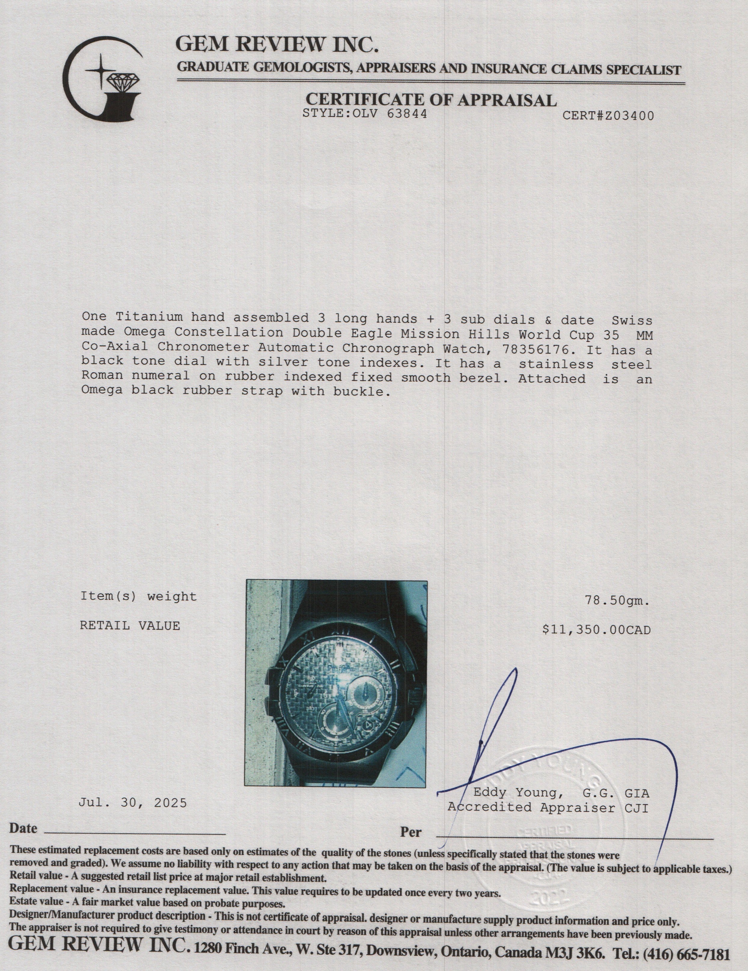 Titanium Constellation Double Eagle Mission Hills World Cup 35 MM Co-Axial Chronometer Automatic Chronograph Watch Black Dial