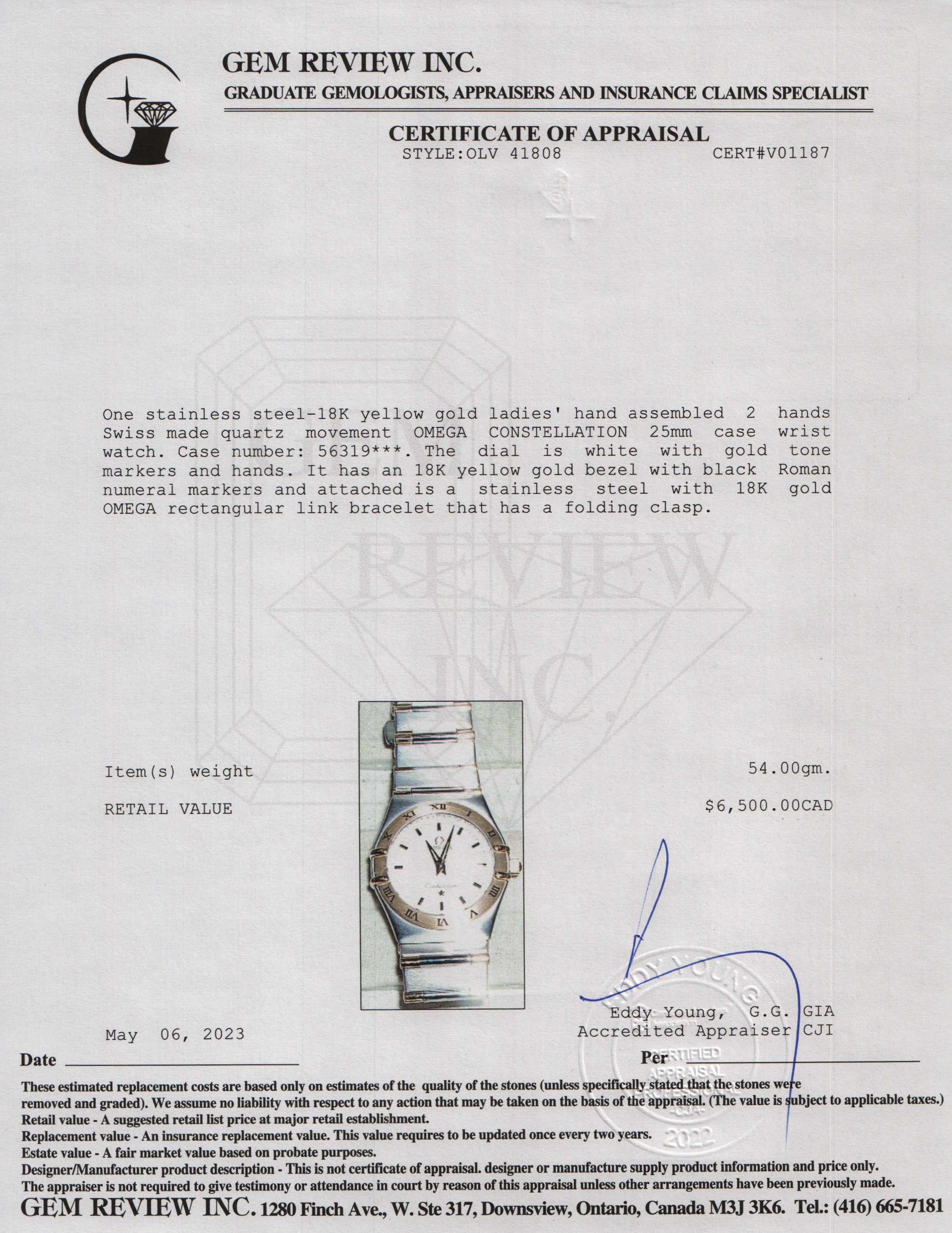 Included Items: Original Omega Box, Warranty Card, Booklet and Gem Review Appraisal