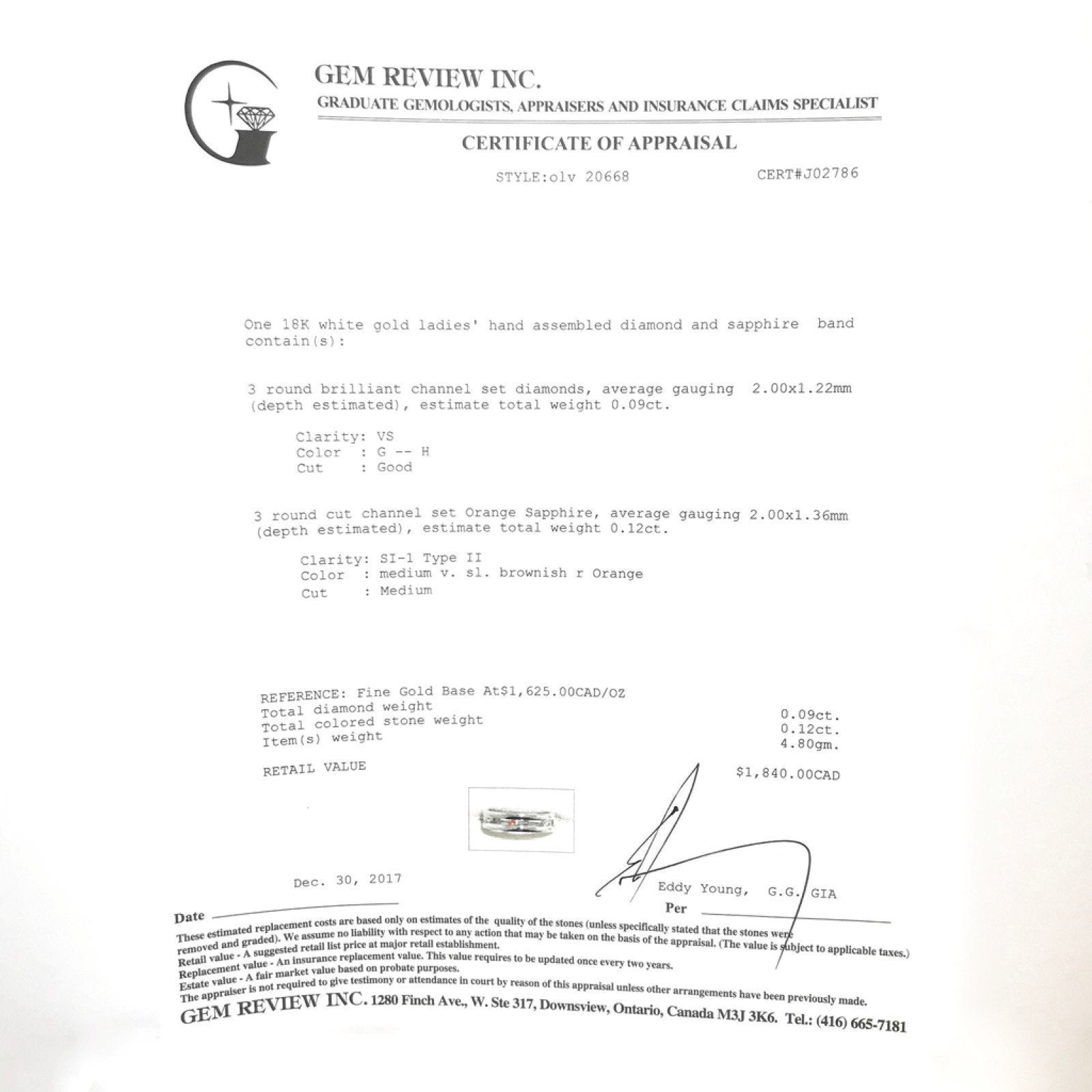 Orange Sapphire and Diamond Band in 18kt White Gold; Diamonds, Approximately 0.09 Total Carat Weight; Approximately 0.12 Total Orange Sapphire Carat Weight; Size 6; Comes with $1,840 Gem Review Appraisal