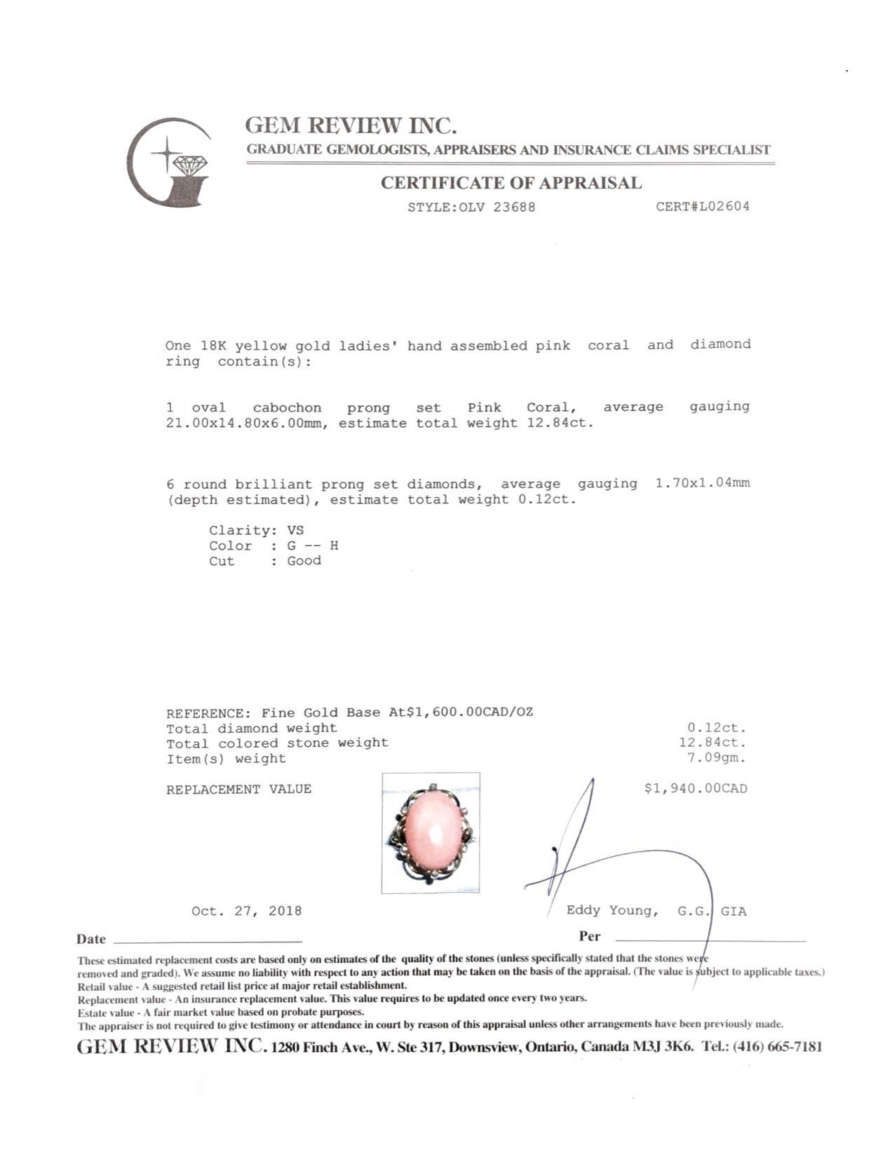 - 1 Oval Cabochon Pink Coral, 21 x 14.80 x 6.00 mm, Approximately 12.84 ct.