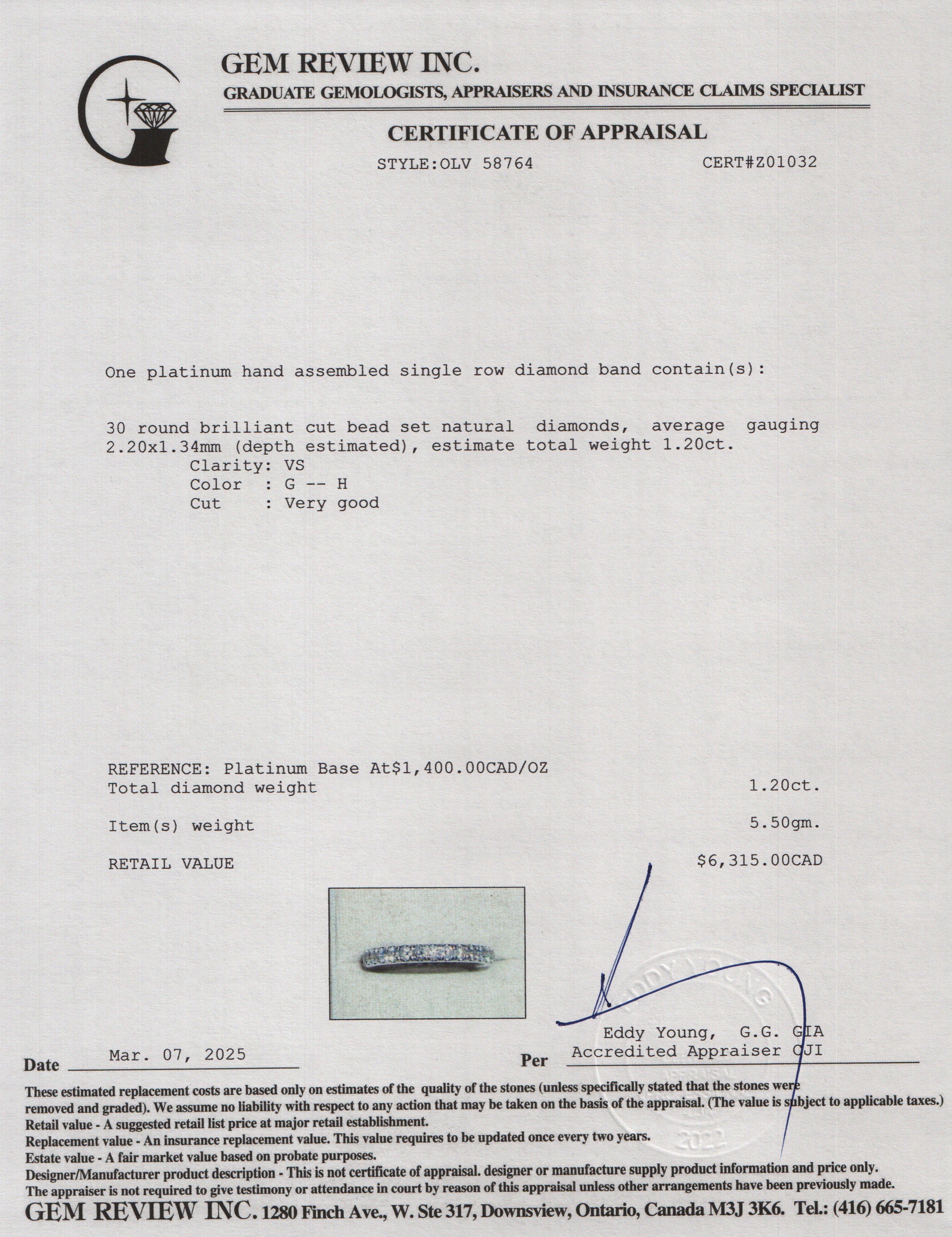 Platinum 1.20 tcw. Diamond Eternity Band Ring, Size 6