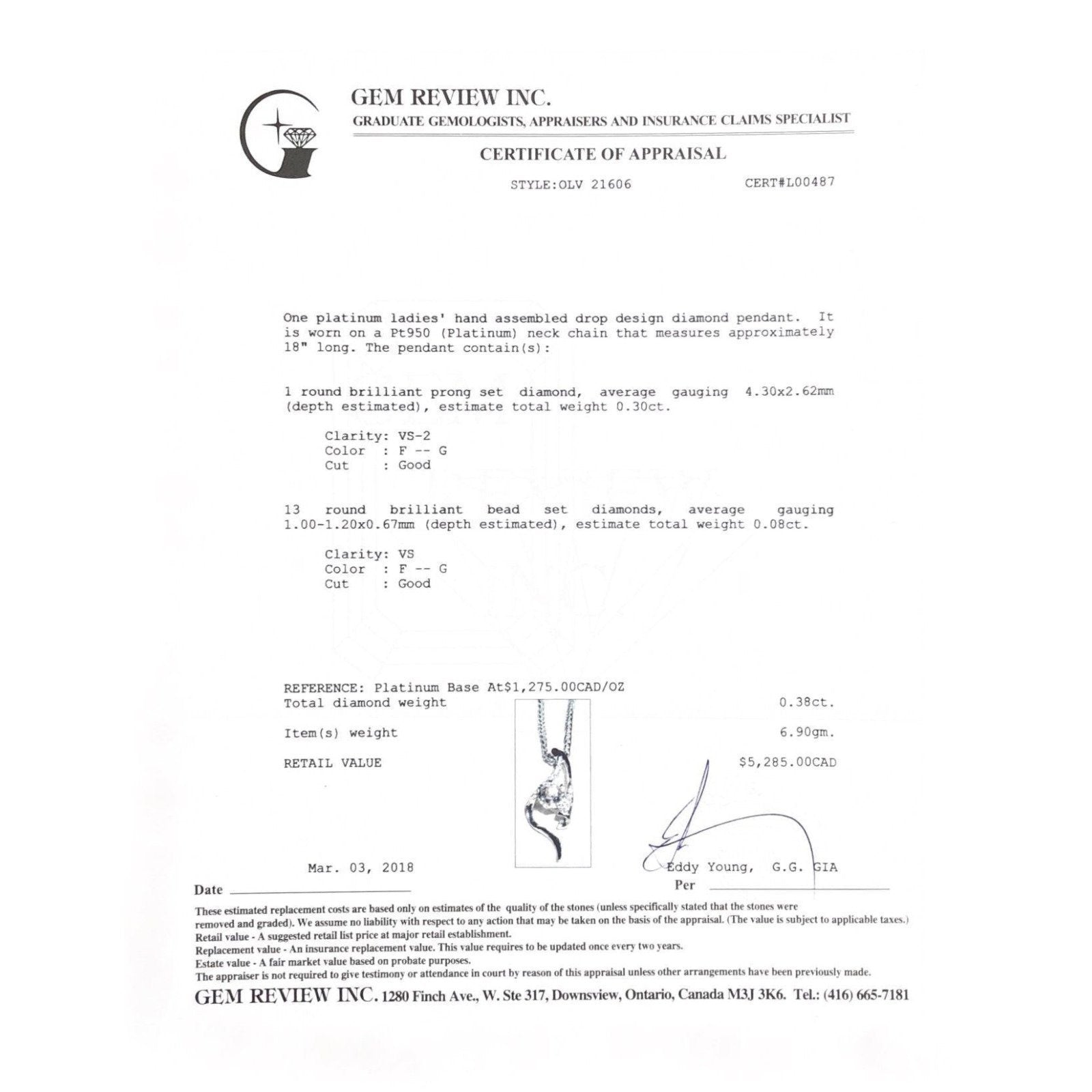 Platinum Ladies' hand assembled drop design diamond pendant; Approximately 18" Long; Total Carat Weight 0.38; Comes with Gem Review Appraisal