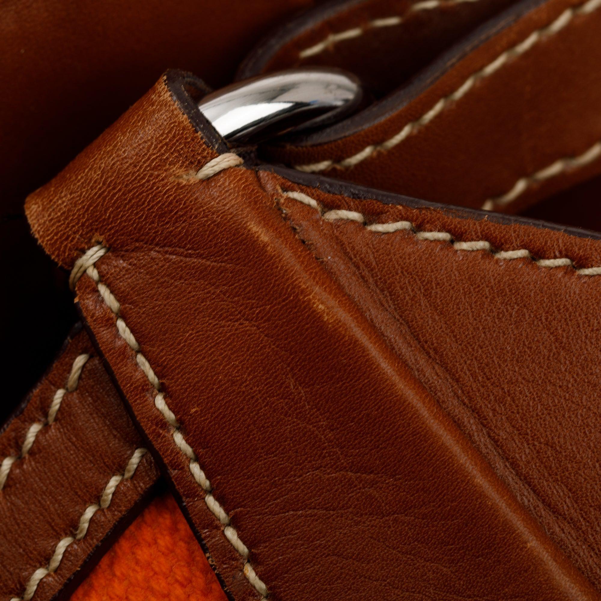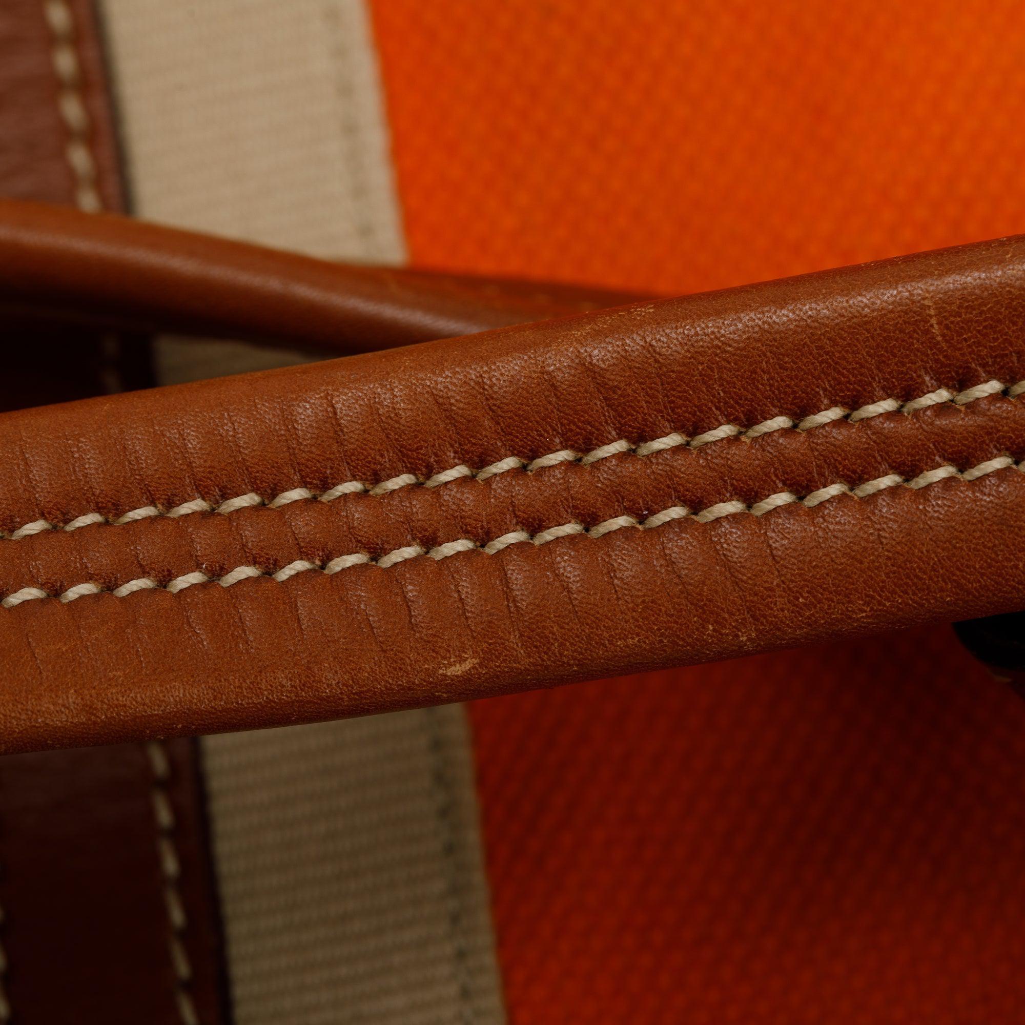Condition: Good; slight scratches at exterior leather trim; some discoloration at exterior canvas; slight scuffing at exterior corners and edges; shape has relaxed due to wear; clean interior